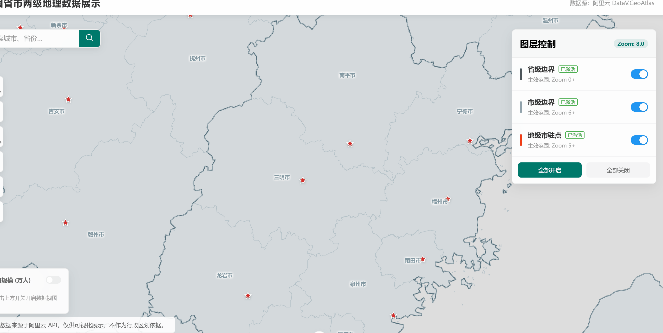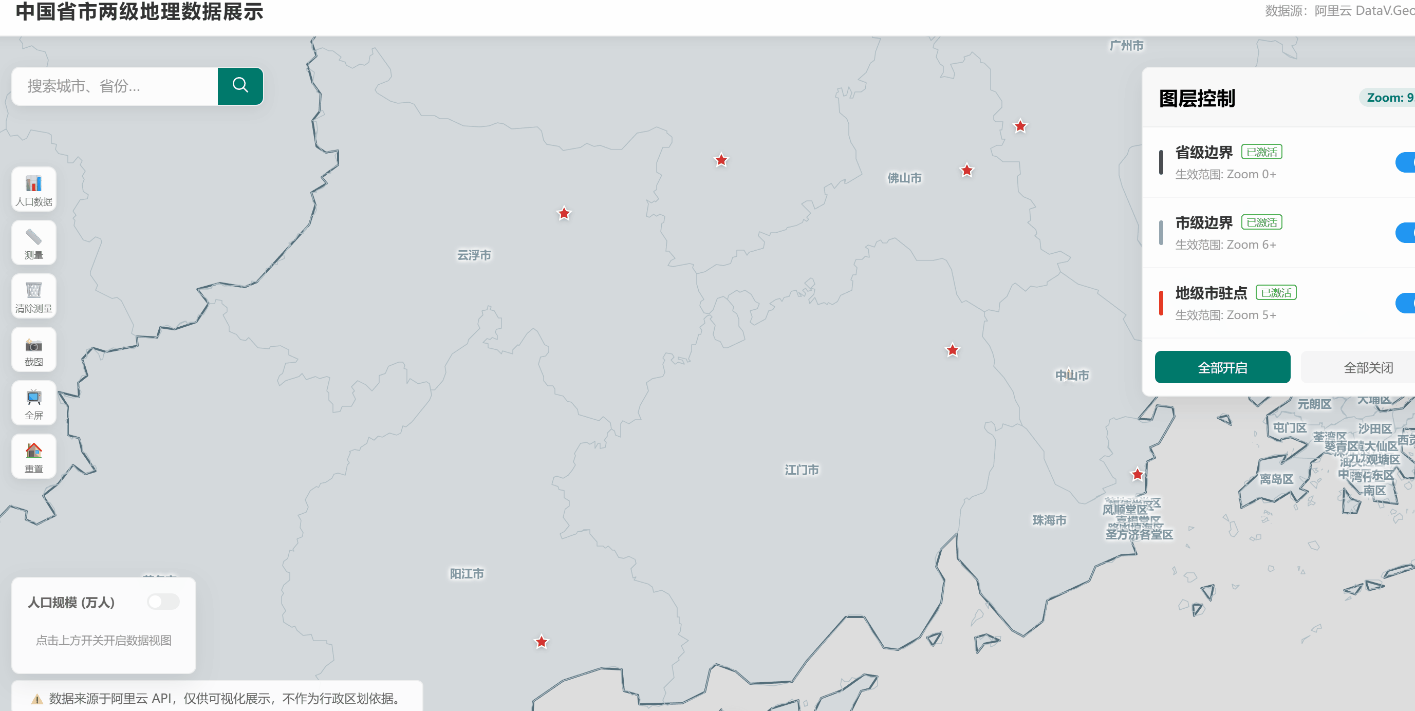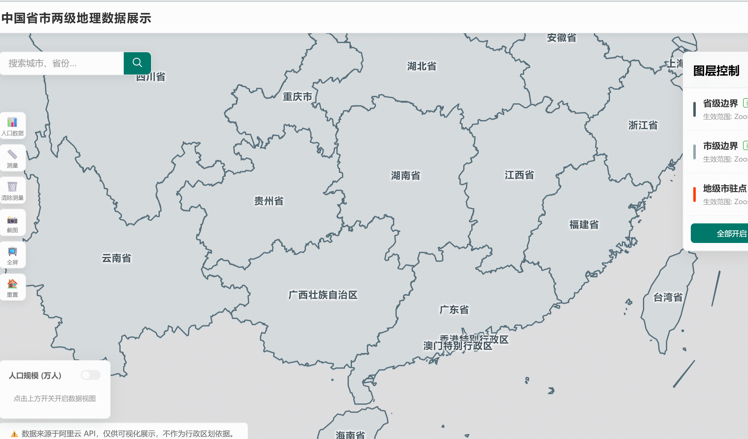 本文展示是是新中地学员使用AI编程制作的**"基于 Vue3 + Leaflet 开发的中国省市两级地理数据可视化系统"**,支持地图展示、搜索定位、图层控制等功能。