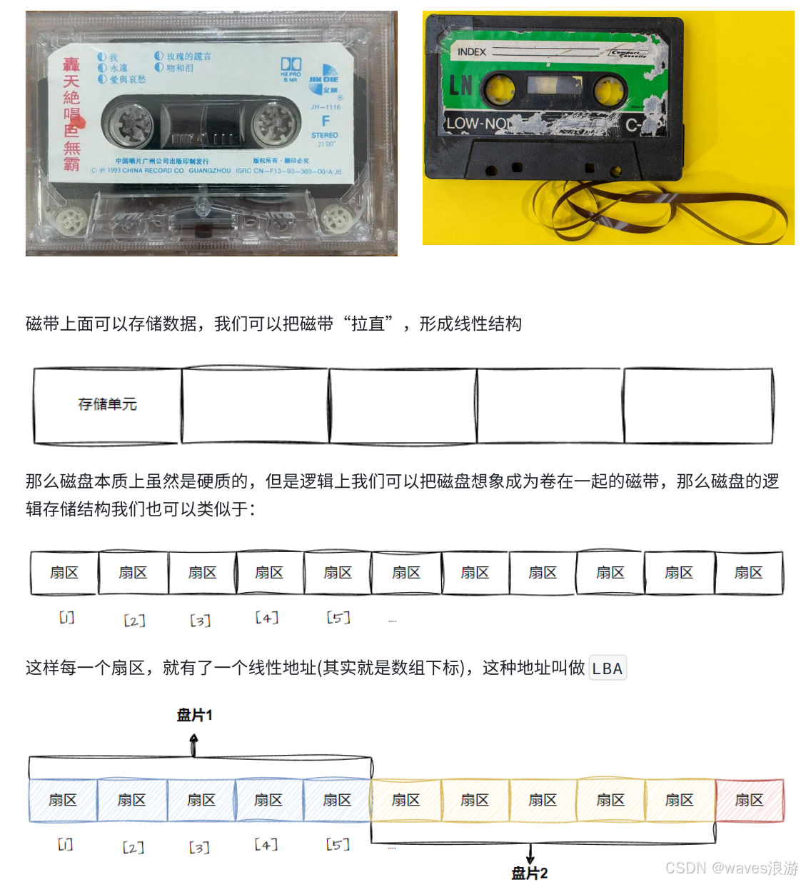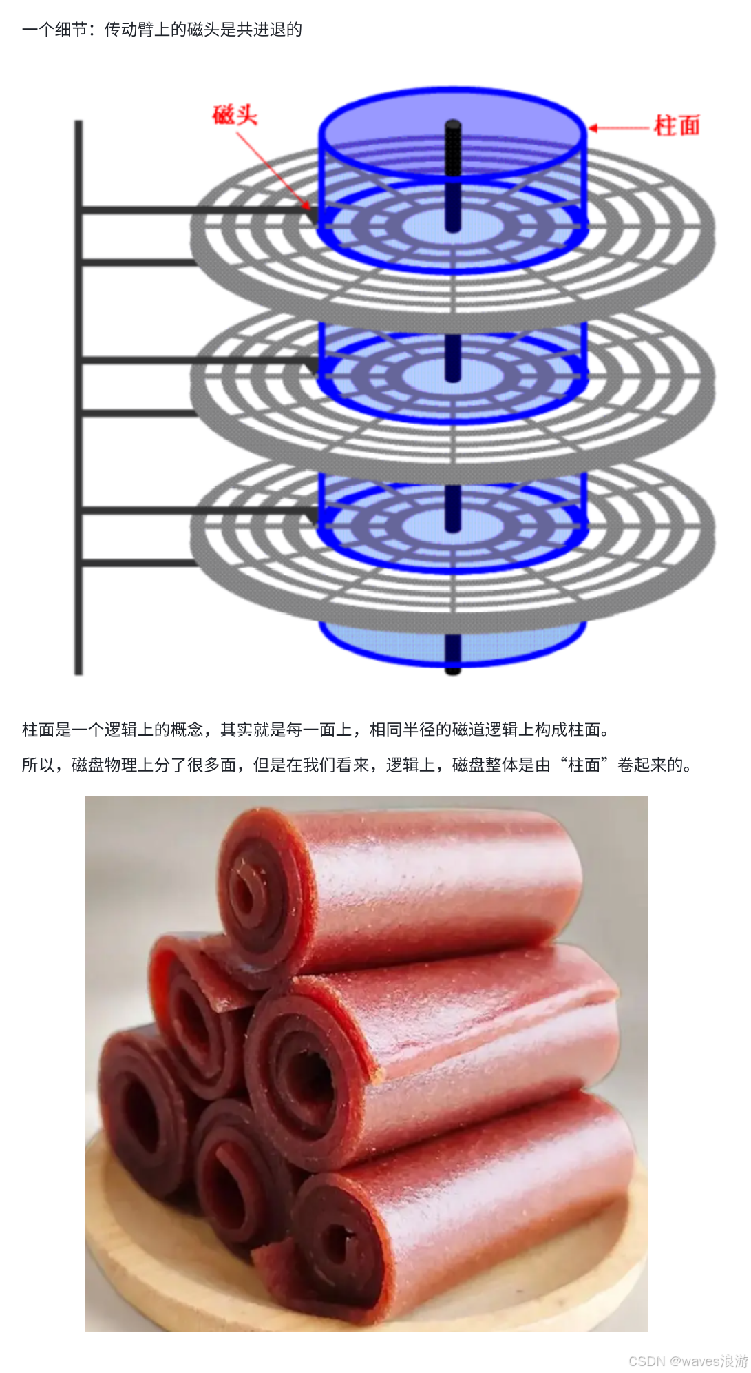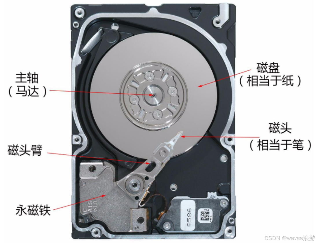 - 细节:传动臂上的磁头是共进退的(这点比较重要,后面会说明)