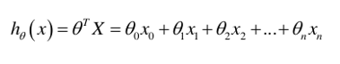 h_\theta(x) = \theta_0 + \theta_1 x_1 + \dots + \theta_n x_n = \theta^T x