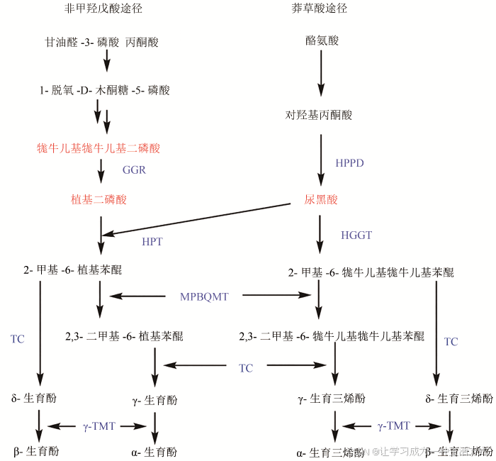 维生素E的生物合成途径在1979年被初步勾勒[46]。20世纪90年代,以拟南芥和集胞藻6803作为模式生物,维生素E合成途径中关键酶被克隆研究,维生素E合成途径逐渐被完善[47]。
