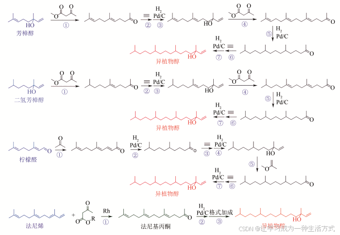 异植物醇是一种无色油状液体,在维生素E结构中提供侧链。根据制备过程中重要中间体的不同,异植物醇的主要制备工艺可分为假紫罗兰酮工艺和芳樟醇工艺(图4)。