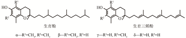 维生素E(Vitamin E)早在1922年被人们发现,因人和动物缺乏可能导致不孕[1],又被称为生育酚,是一种脂溶型维生素,其外观呈淡黄色或金黄色透明状黏稠液体。根据疏水性尾部的饱和度和芳香环上甲基数目和位置的不同,维生素E可分为八种类型,分别是α、β、γ、δ生育酚和α、β、γ、δ生育三烯酚(图1)[2]。在动物体内,生育酚和生育三烯酚均可被吸收,但α-生育酚与生育酚转移蛋白亲和度更高,可以被优先运输和吸收,因此α-生育酚是活性最高的维生素E形式[3-4],通常也被直接称作维生素E。
