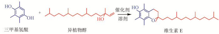 全球80%以上的维生素E为化学全合成品,主要生产方式为2,3,5-三甲基氢醌(以下简称"三甲基氢醌")(主环)和异植物醇(支链)两种中间体以"一步缩合法"合成(图2),收率高达95%以上[28],基本已经没有提升的空间[29]。