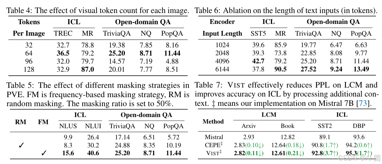 - 通用性:在Mistral 7B上,VIST较CEPE‡在LCM任务上PPL降低0.21,ICL任务准确率提升3.7个百分点,证明跨模型适用性。