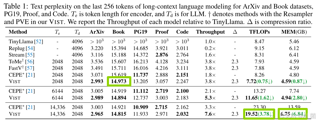 - 与CEPE∗相比,VIST处理14336个token时,TFLOPs减少3.78,内存占用减少6.84GB,吞吐量提升2.3×。