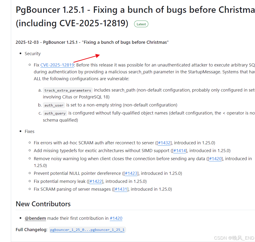 https://github.com/pgbouncer/pgbouncer/releases 该网址是pgbouncer的官方下载地址,从其最新版本更新介绍来看,非常有必要使用最新版,也就是1.25.1版本,选择该版本的理由是此版本修复了一个严重的安全漏洞: CVE-2025-12819