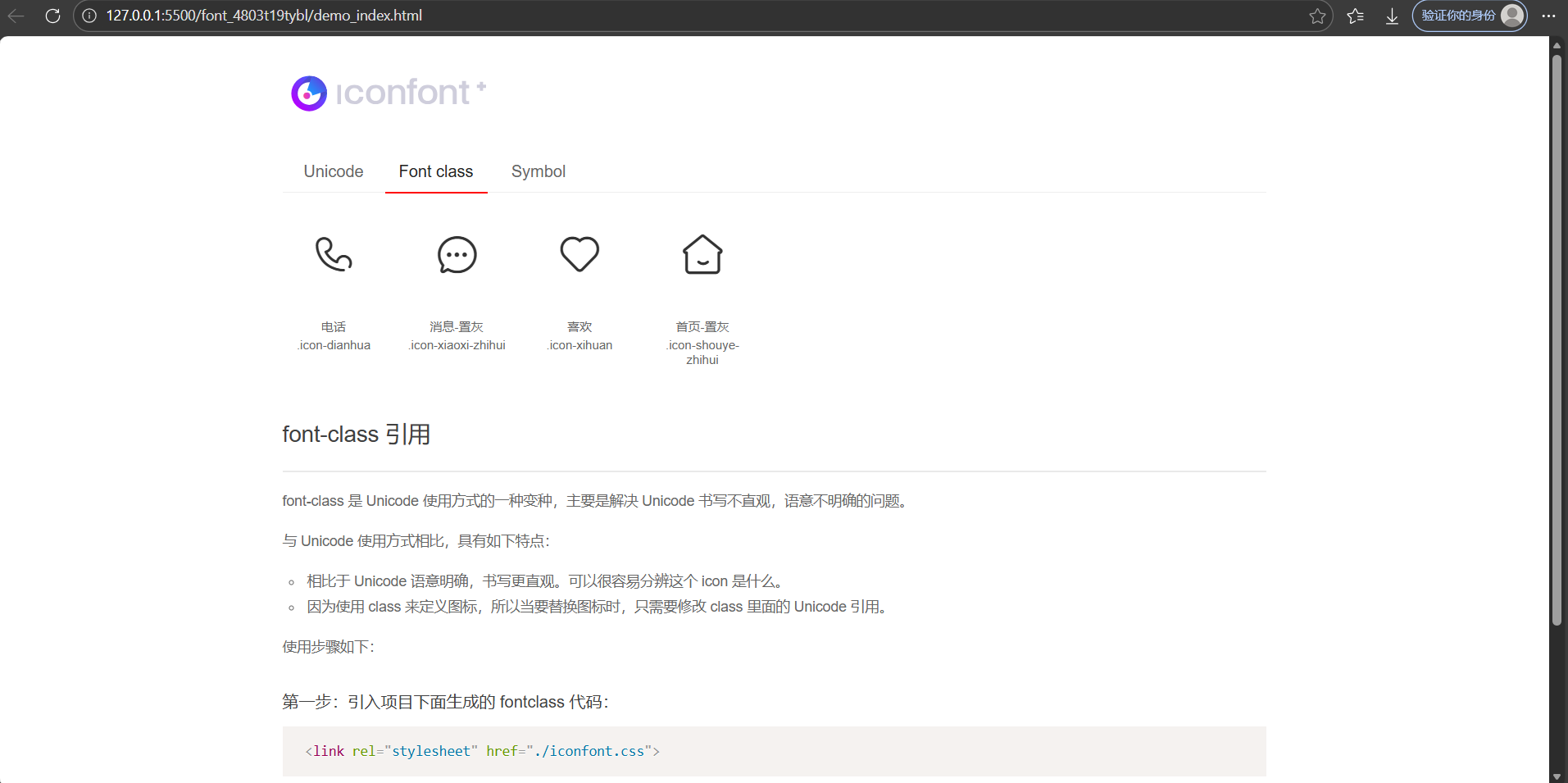 打开该文件,然后在浏览器中查看,可以查看字体图标的使用方式