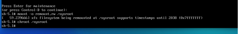 此时系统会显示root shell,磁盘的实际根文件系统会只读挂载到****/sysroot****,需要将根文件系统更改为读写模式;