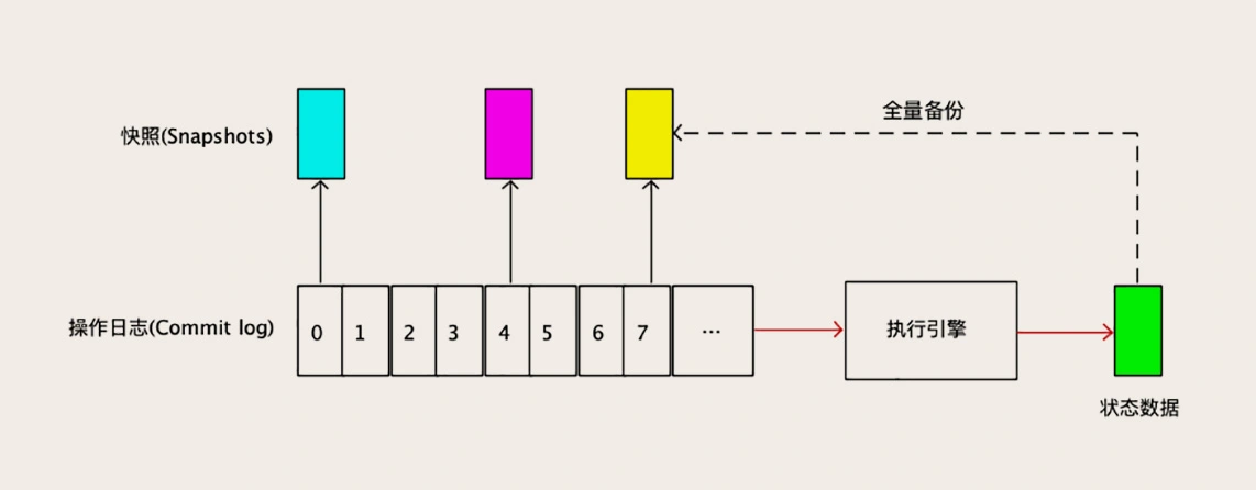 任何一个存储系统,无论它存储的是什么数据,用什么样的数据结构,都可以抽象成一个状态机。存储系统中的数据称为状态(也就是MySQL中的数据),状态的全量备份称为快照(Snapshot,就像给数据拍个照片一样。我们按照顺序记录更新存储系统的每条操作命令,就是操作日志(Commit Log,也就是MySQL中的Binlog)。
