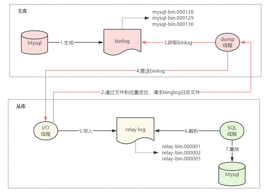 MySQL主库在收到客户端提交事务的请求之后,会先写入Binlog,然后再提交事务,更新存储引擎中的数据,事务提交完成后,给客户端返回操作成功的响应。同时,从库会有一个专门的复制线程,从主库接收Binlog,然后把Binlog写到一个中继日志里面,再给主库返回复制成功的响应。从库还有另外一个回放Binlog的线程,去读中继日志,然后回放Binlog更新存储引擎中的数据。