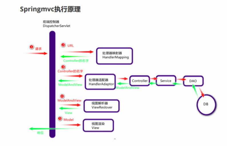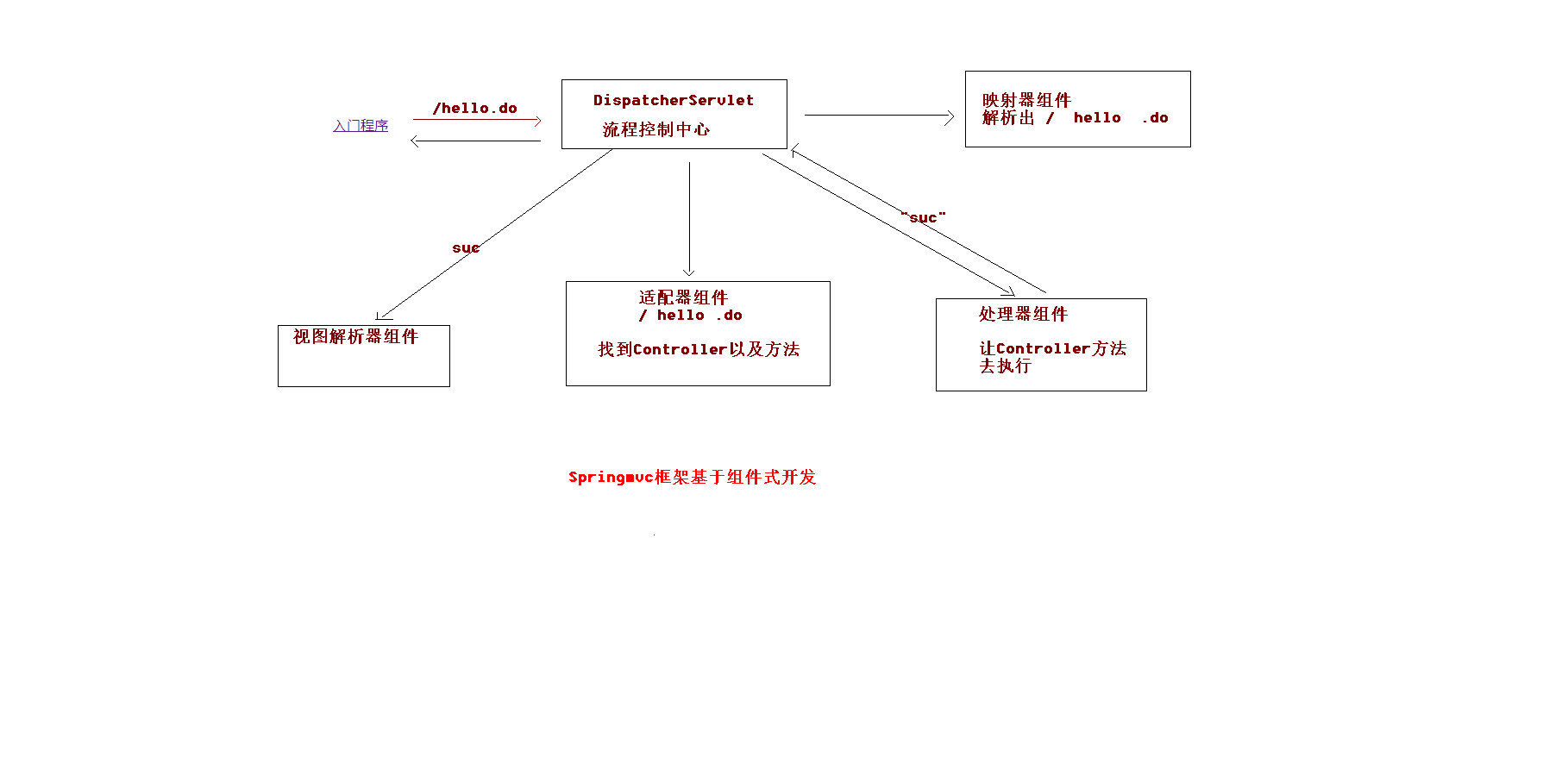 所有请求都会被DispatcherServlet堵住,然后解读url找到处理器映射器,解读/hello.do