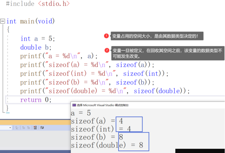 1.定义变量后,操作系统会为变量分配空间,空间大小与数据类型有关。