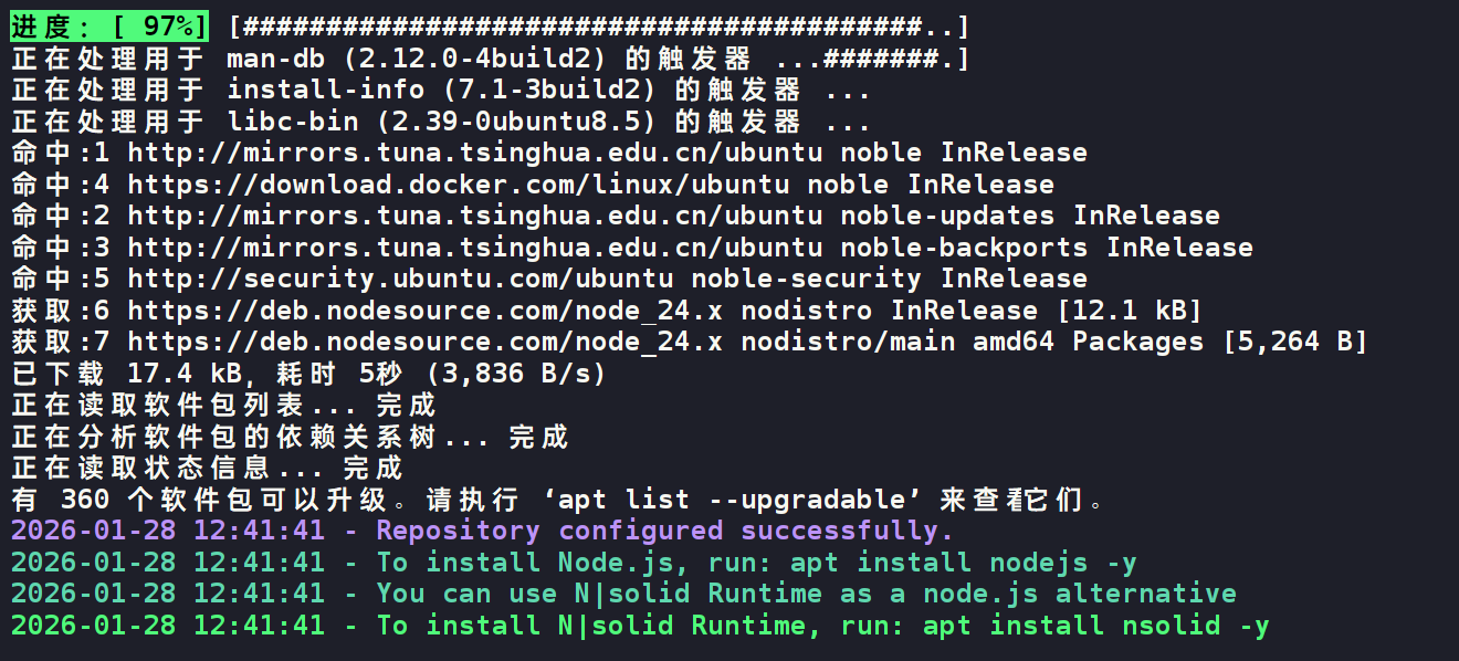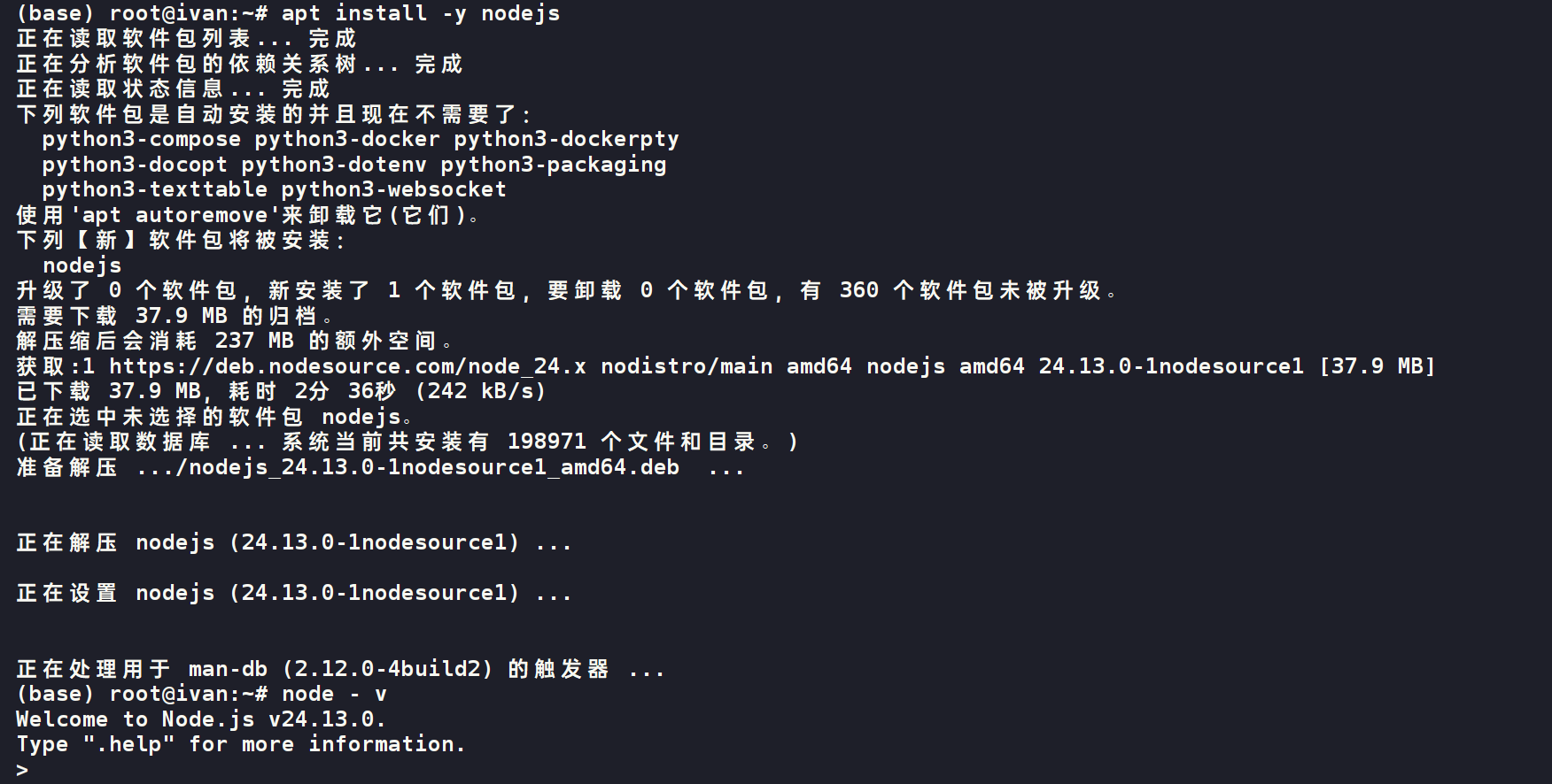 执行以下命令,确保系统包管理器的索引是最新的,并安装 Node.js 服务。