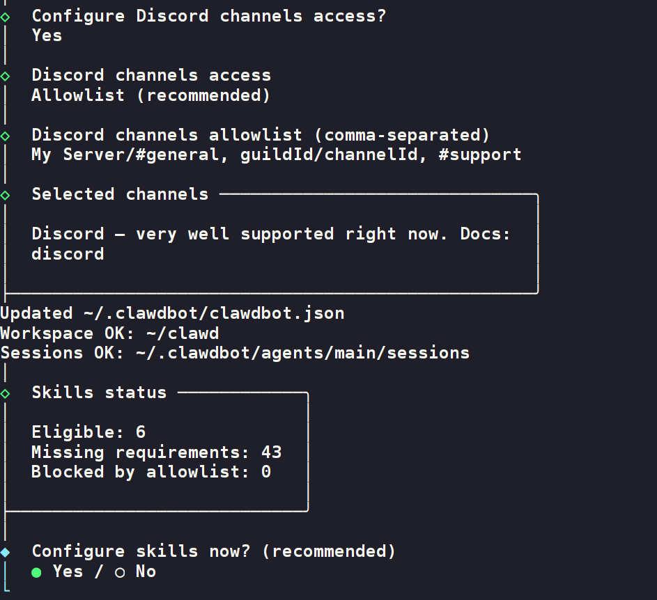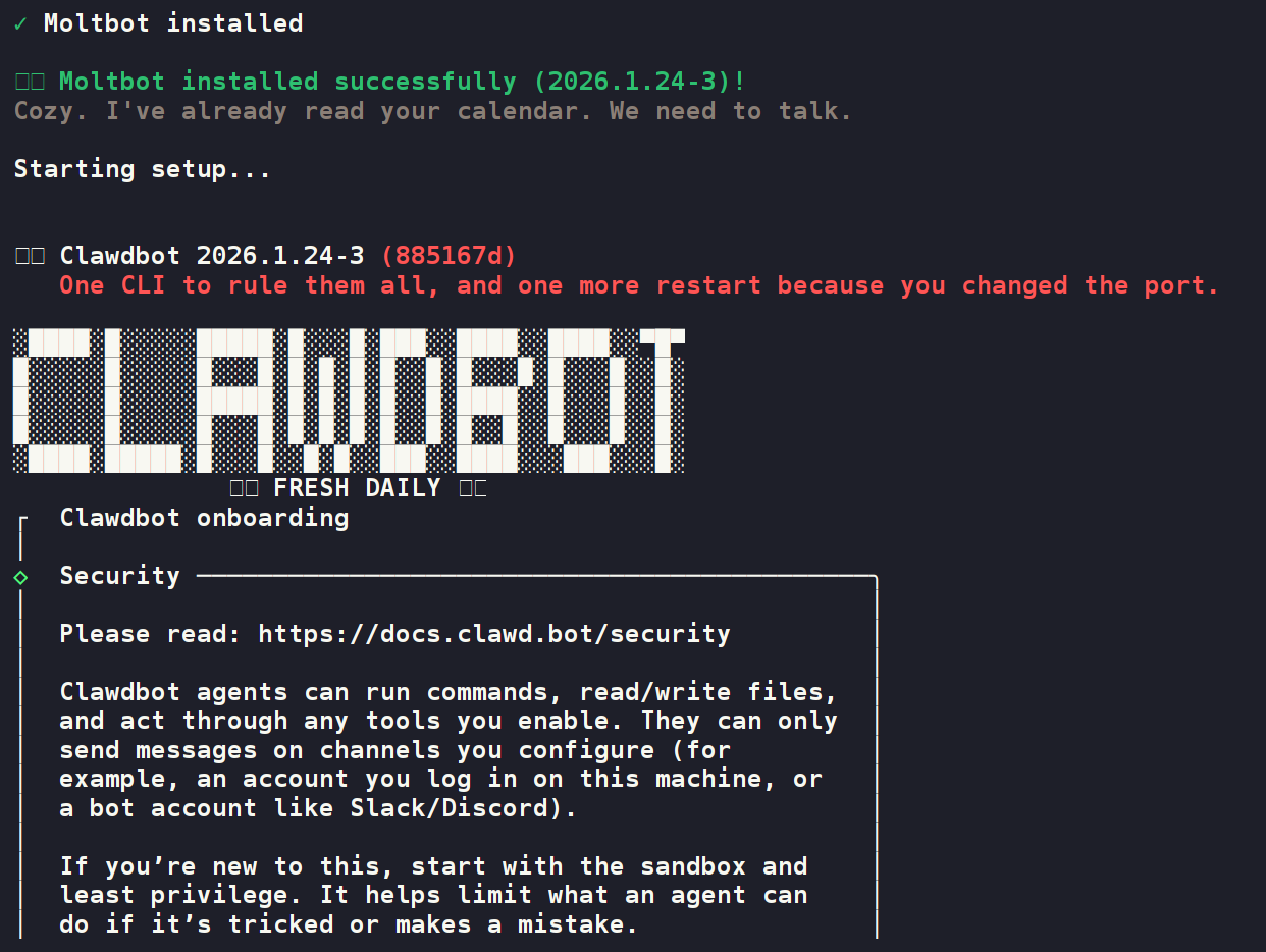 随着编译日志的滚动,屏幕最终会渲染出一个极具辨识度的ASCII Art,呈现出 CLAWDBOT 的字样。