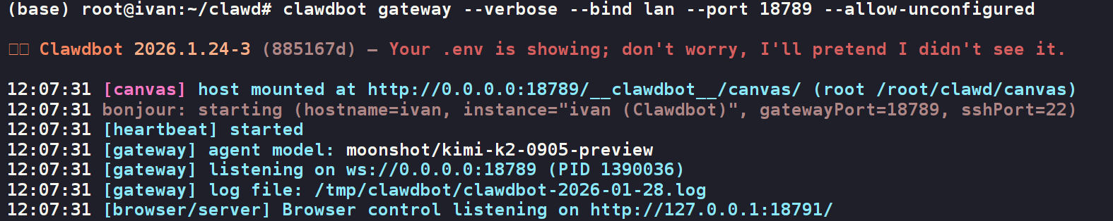 clawdbot gateway --verbose --bind lan --port 18789 --allow-unconfigured