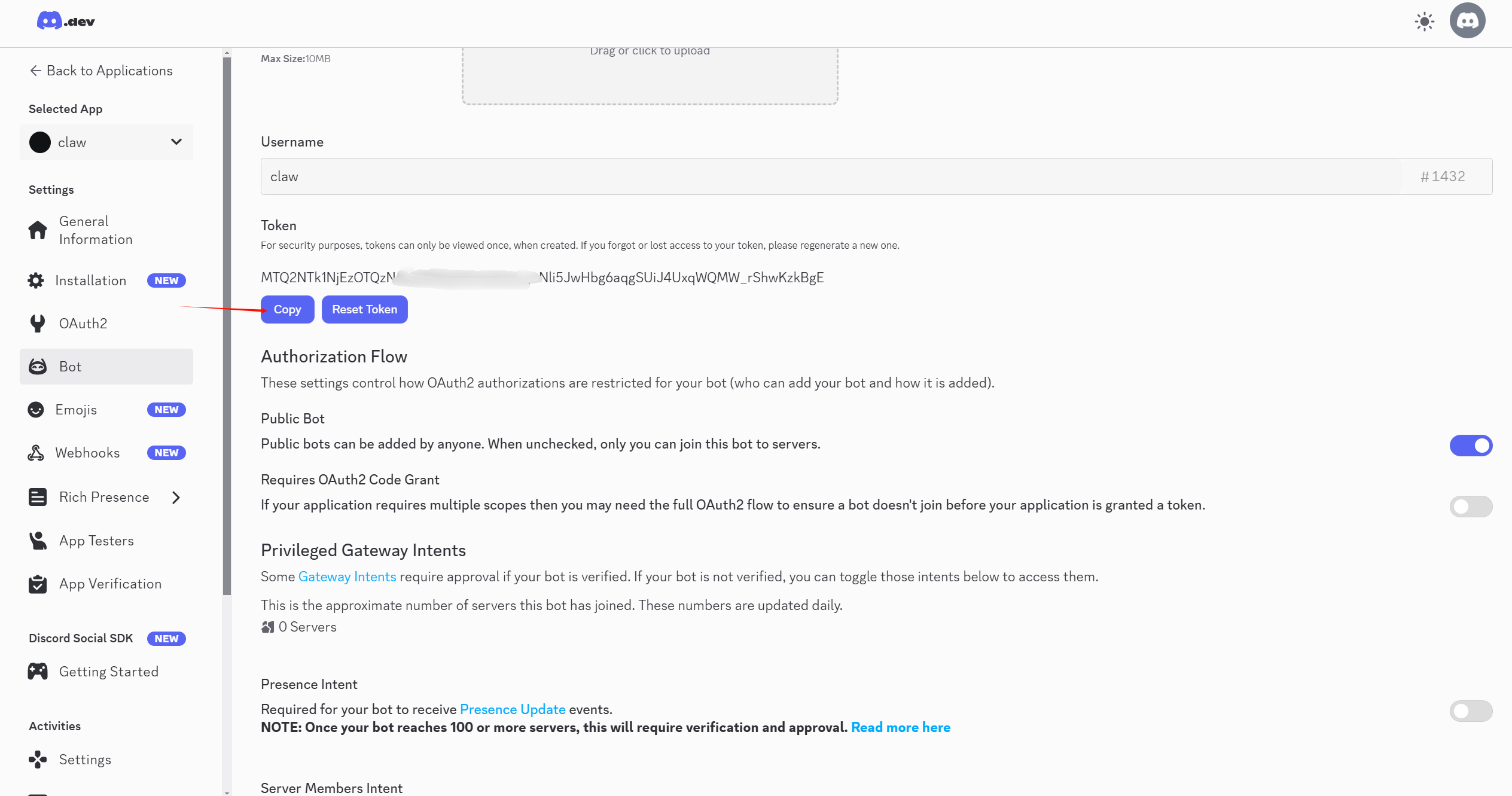 在 Bot 菜单中,重置并获取核心凭证。此 Token 相当于数字员工的唯一身份密钥,必须严格保密。
