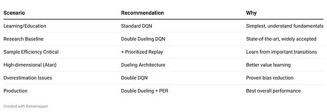 Double Dueling DQN 把两边的好处结合起来,既减少估计噪声,又提高表示效率。实测中这个组合最稳健,达到峰值性能的速度和可靠性都优于单一改进。