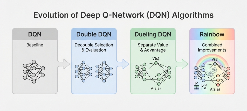 DQN 是基线,用单一网络选动作、评估动作。它引入了目标网络来稳定"移动目标"问题,但容易过估计 Q 值,噪声让智能体去追逐根本不存在的"幽灵奖励"。