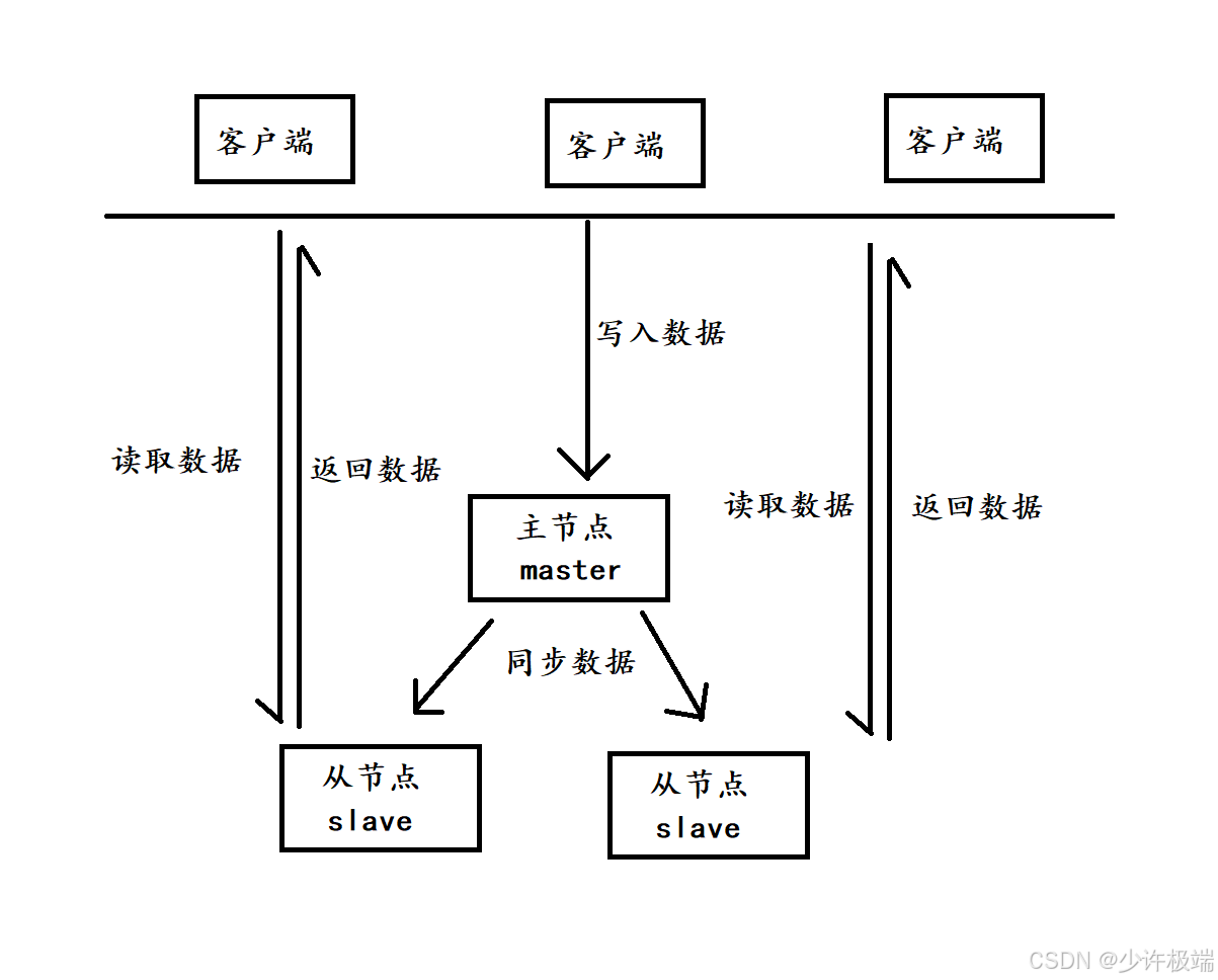 主从复制用于在多台服务器之间同步数据。其核心思想是:一个主节点(Master)负责处理数据更新,并将这些更新自动同步到一个或多个从节点(Slave)。