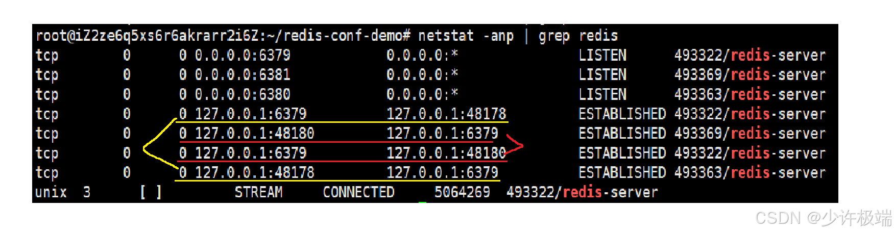 我们可以看到上图中redis监听了7个端口, 划红线的为一对, 划黄线的为一对, 其中主节点相当于服务器, 从节点相当于客户端