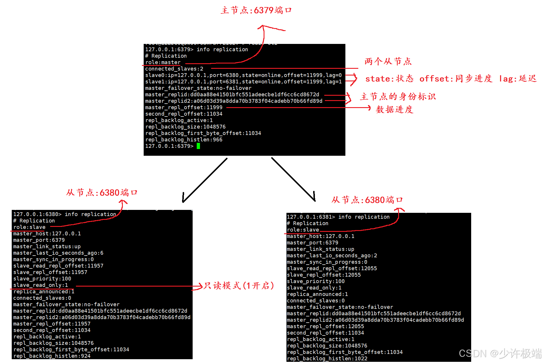3. offset 为偏移量, 在主节点中, 每个修改命令(类似于set/lpush/zset这样)会有相应字节数, 每执行一次修改操作, 主节点的offset会累加对应的字节数。在从节点中, offset表示当前同步进度, 当主从节点的offset值相同时, 代表同步完成