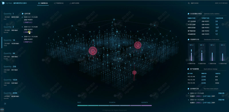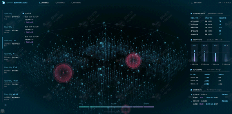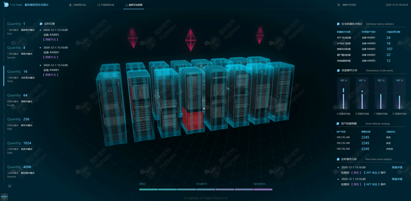 依托 HT for Web 的交互可视化能力,平台实现了服务器状态的直观展示与便捷交互。用户可通过可视化界面查看服务器的实时运行状态、多级关键点的工作情况,以及安全事件的分布与处理进度。界面支持缩放、旋转、平移等操作,能够从不同视角观察服务器状态,同时通过颜色标记、动态告警等可视化手段,让管理人员快速捕捉异常信息,提升监控效率。