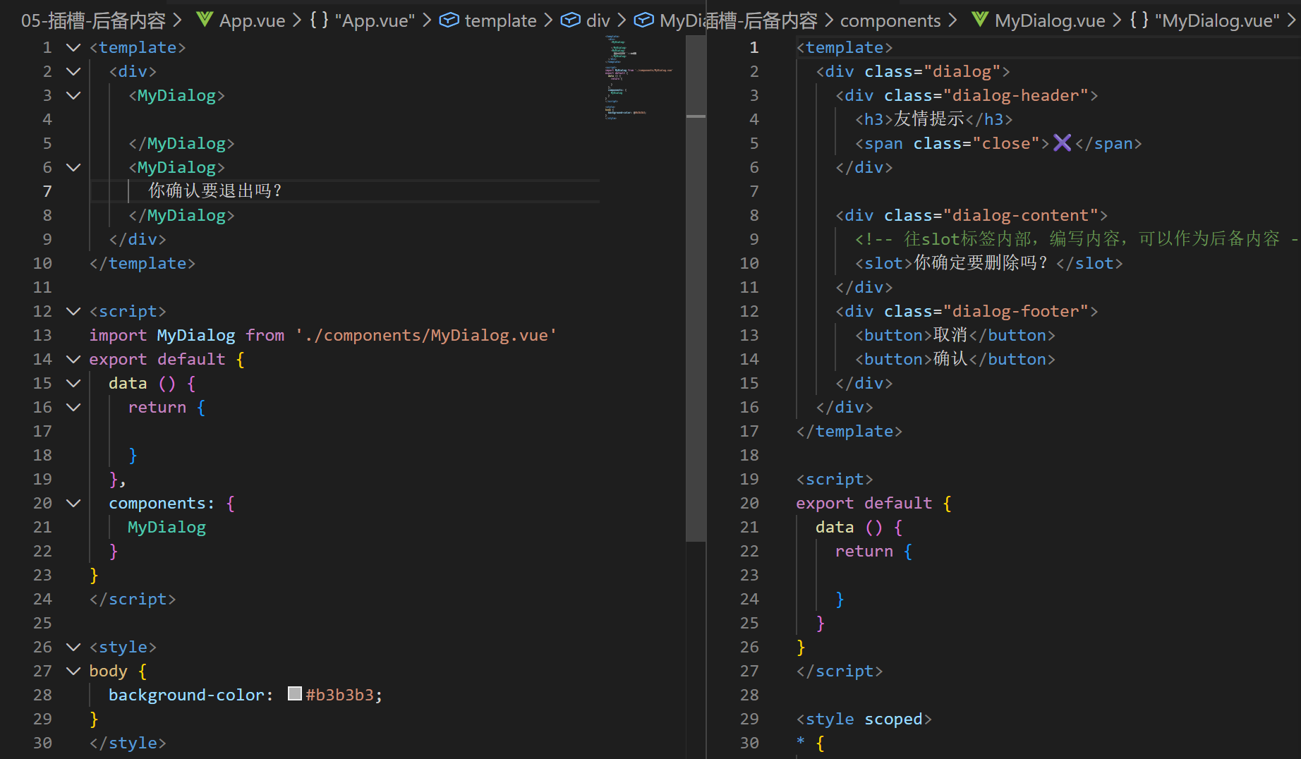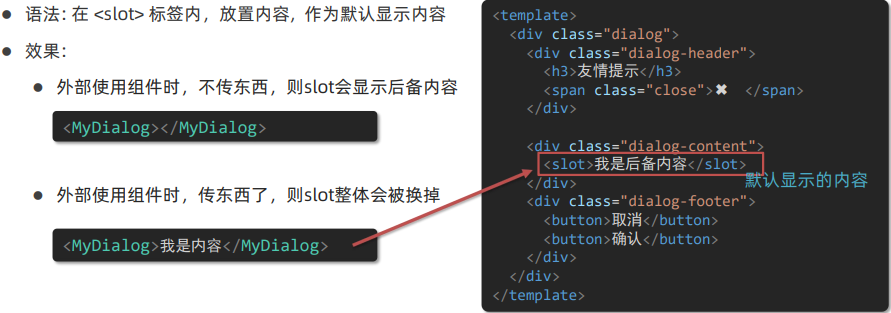 槽后备内容:封装组件时,可以为预留的 `<slot>` 插槽提供后备内容(默认内容)。