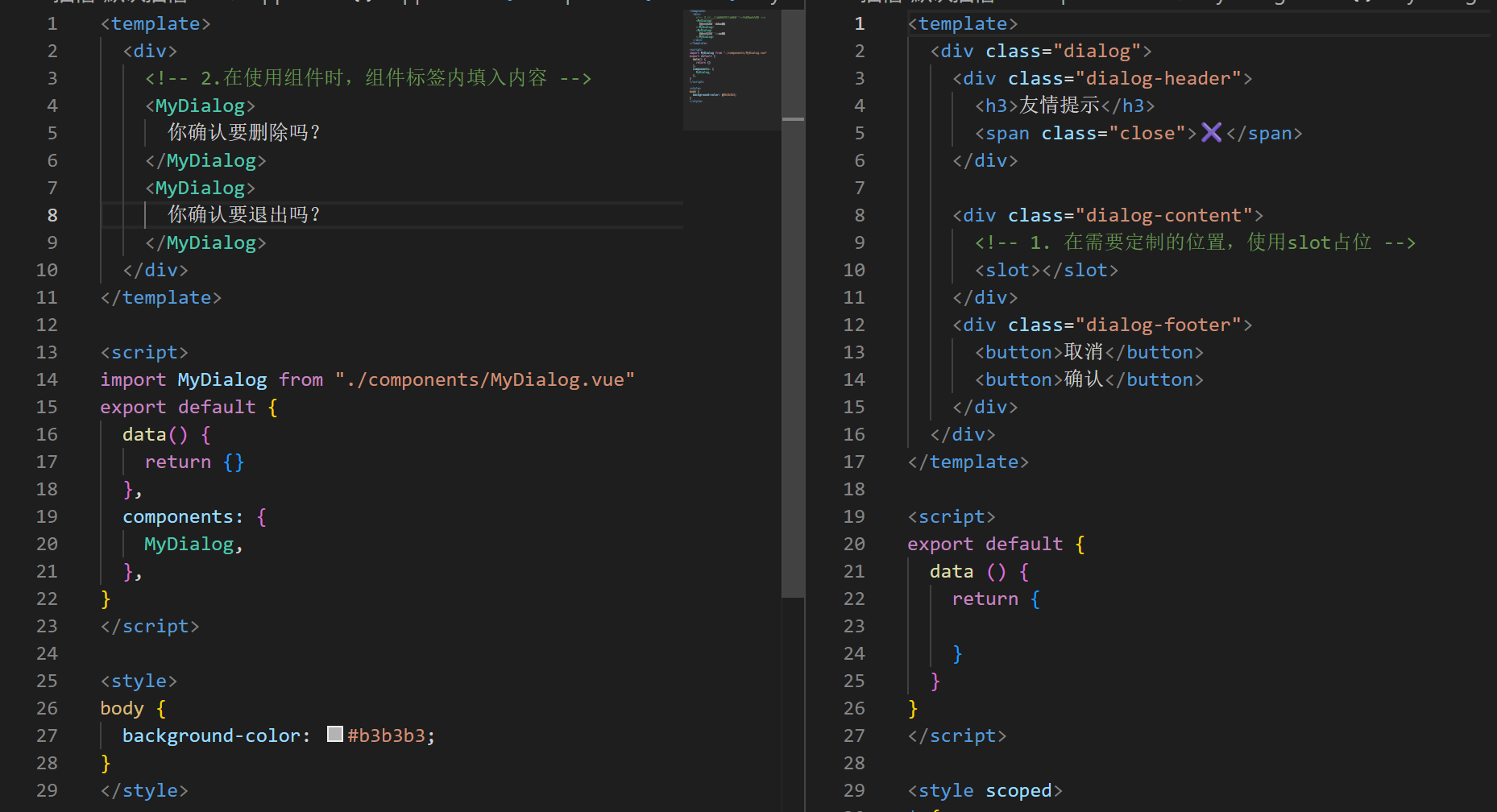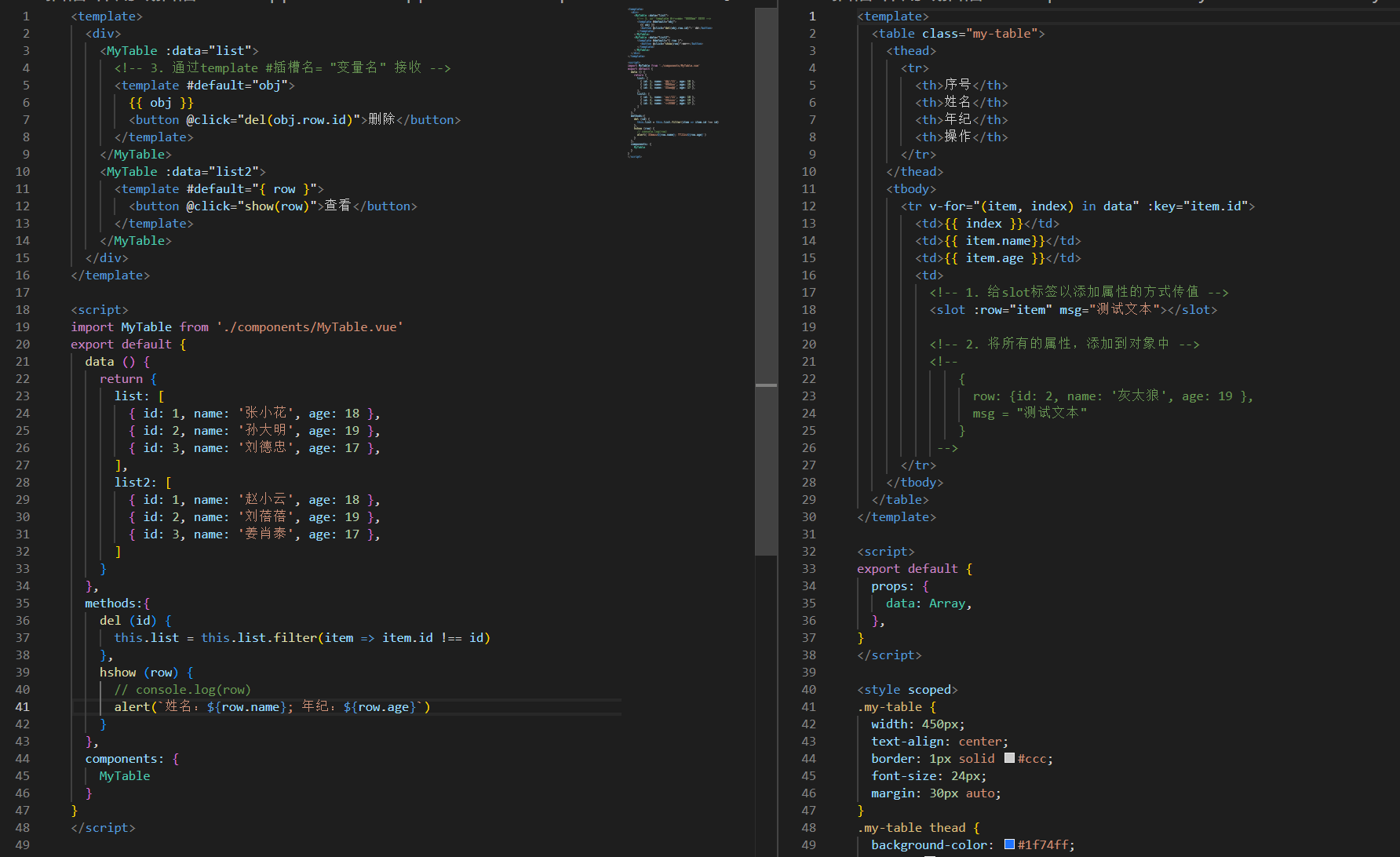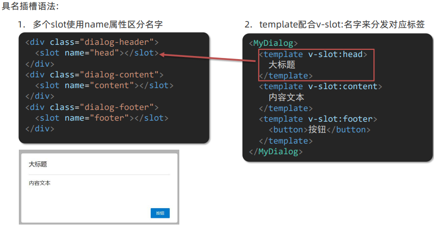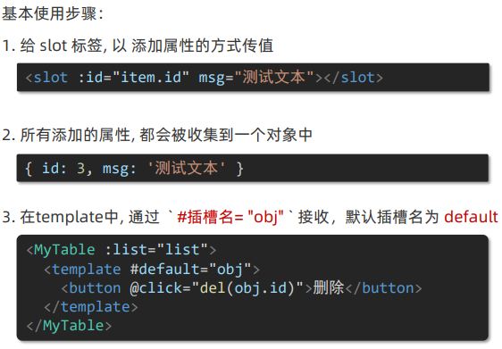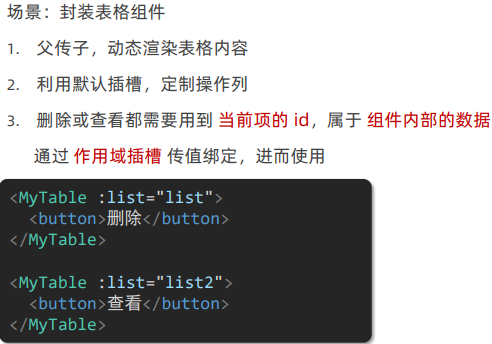 作用域插槽: 定义slot插槽的同时, 是可以传值的。给插槽上可以绑定数据,将来使用组件时可以用