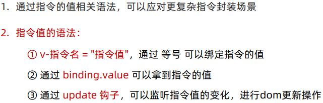 (2)通过 binding.value 可以拿到指令值,指令值修改会 触发 update 函数。