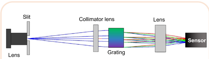 光线通过狭缝(slit)限制其位置和大小,随后经过光栅(Grating)进行色散,分散后的光线被传递到传感器上。
