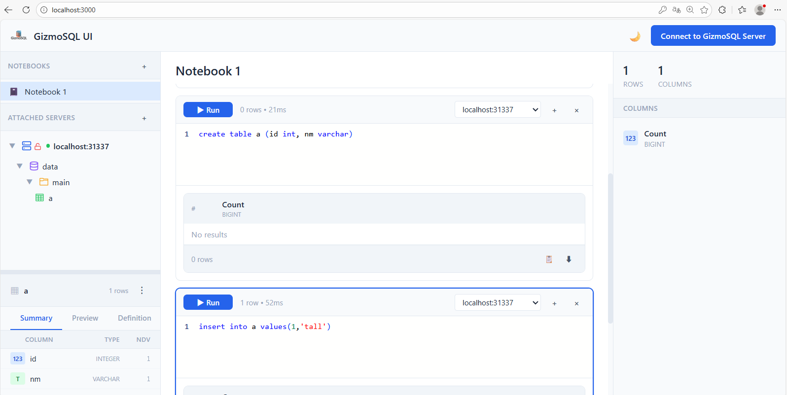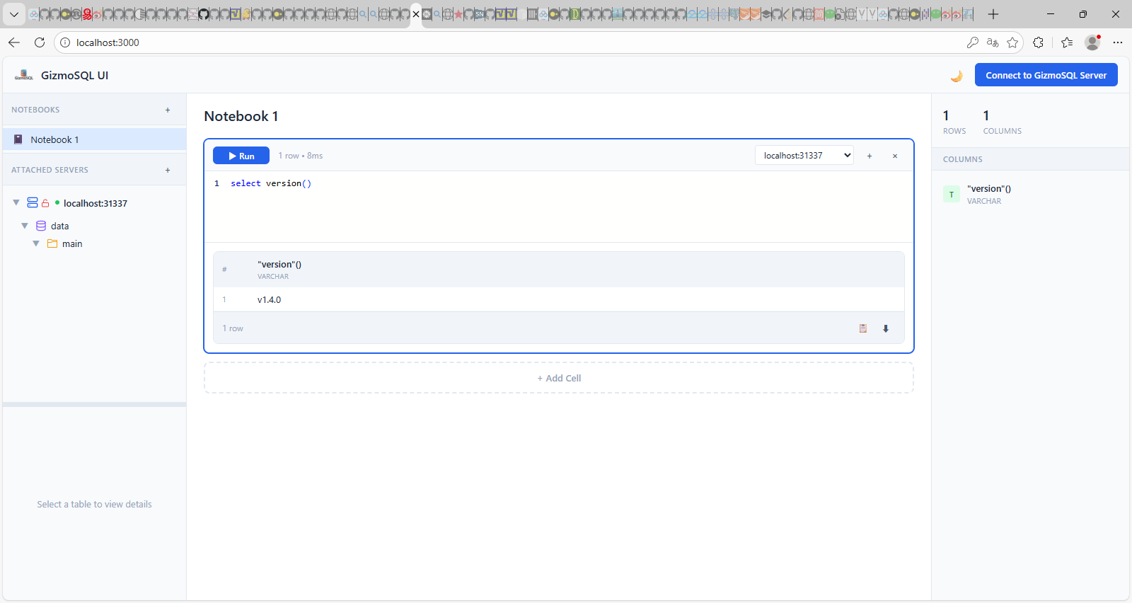 在地址栏输入http://localhost:3000, 然后点击Connect to GizmoSQL Server按钮,输入用户名和口令。就在左侧生成了目录树,在NoteBook1中选NoteBook1,就可以在笔记本中输入SQL语句。