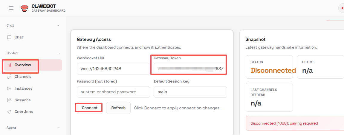 disconnected (1008): unauthorized: gateway token missing (open a tokenized dashboard URL or paste token in Control UI settings)