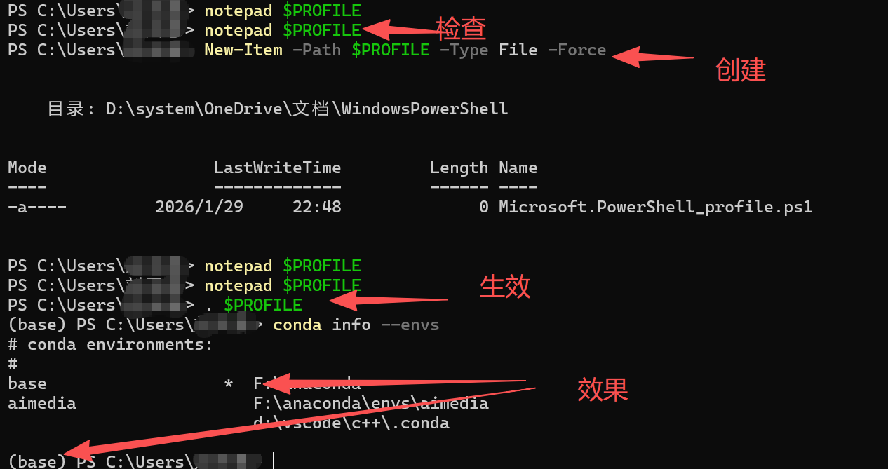 没问题,$PROFILE 对应的 PowerShell 配置文件默认是不会自动创建的,我们需要手动生成它,然后把 Conda 的初始化代码加进去。