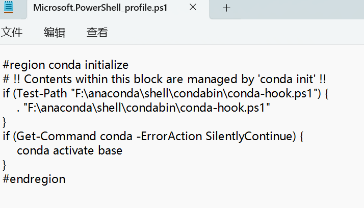 powershell#region conda initialize # !! Contents within this block are managed by 'conda init' !! if (Test-Path "F:\anaconda\shell\condabin\conda-hook.ps1") { . "F:\anaconda\shell\condabin\conda-hook.ps1" } if (Get-Command conda -ErrorAction SilentlyContinue) { conda activate base } #endregion -