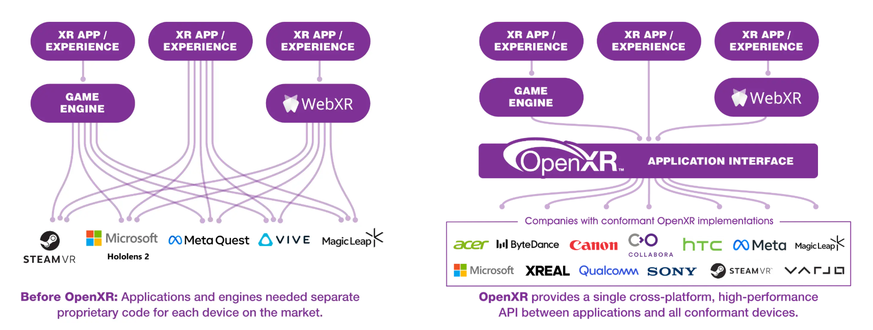 OpenXR 是面向 XR(扩展现实,包含 VR、AR、MR 所有形态)的跨平台、跨厂商开放式接口标准,是行业公认的下一代统一规范。