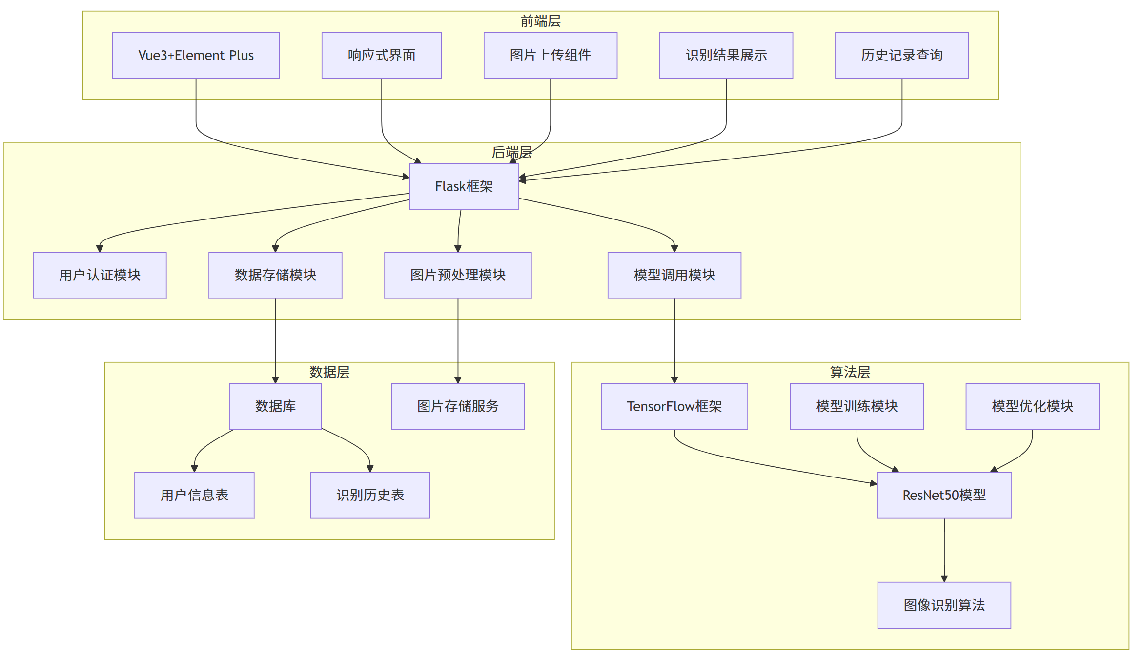 基于深度学习的智能害虫识别系统,帮助农业生产者快速、准确地识别农作物病虫害,提高病虫害防治效率,保障农业生产安全。系统采用前后端分离架构,前端使用Vue3+Element Plus构建用户友好的交互界面,后端采用Flask框架提供高效的数据处理和API服务,核心识别算法基于TensorFlow深度学习框架和ResNet50卷积神经网络模型。