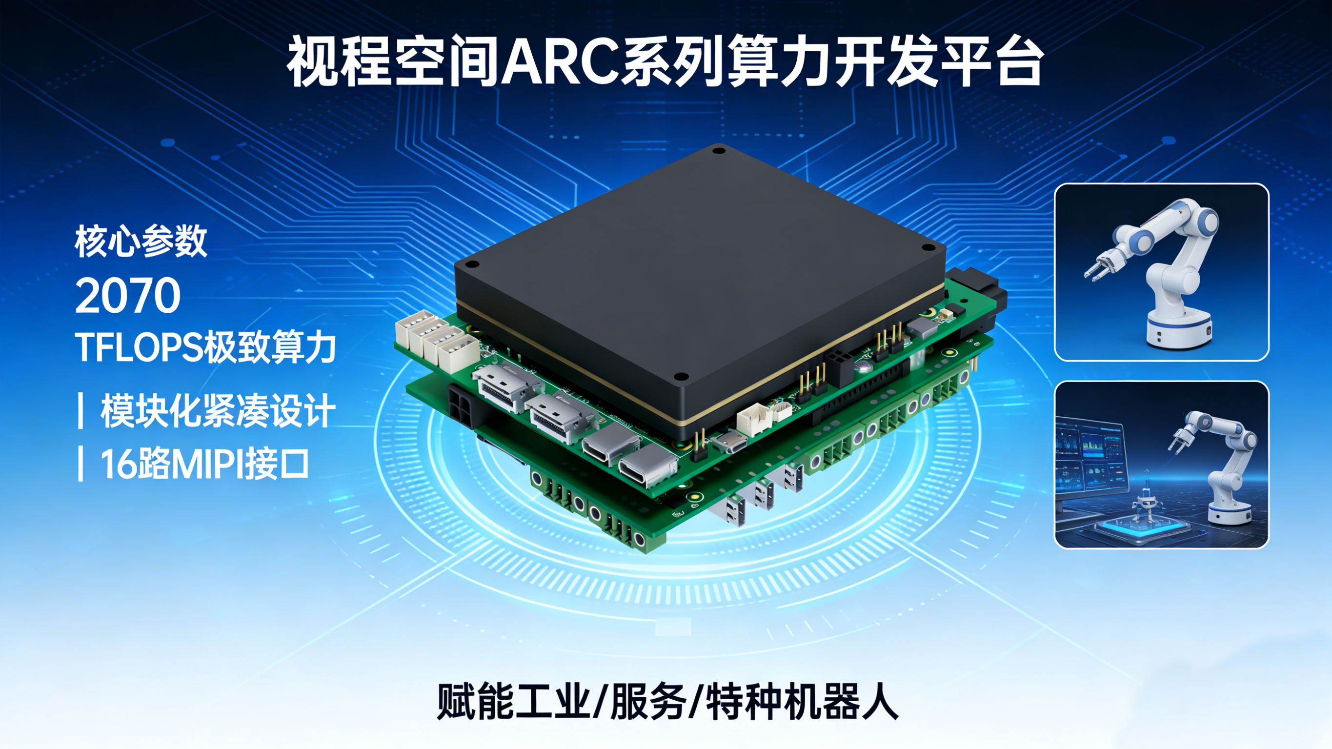 全场景适配,赋能多领域机器人创新发展。视程空间ARC系列凭借其全谱系的算力覆盖、紧凑的设计、全能的接口与强大的功能,能够适配工业、服务、特种等多个领域的机器人应用需求,为不同领域的机器人赋能,推动行业的智能化升级。