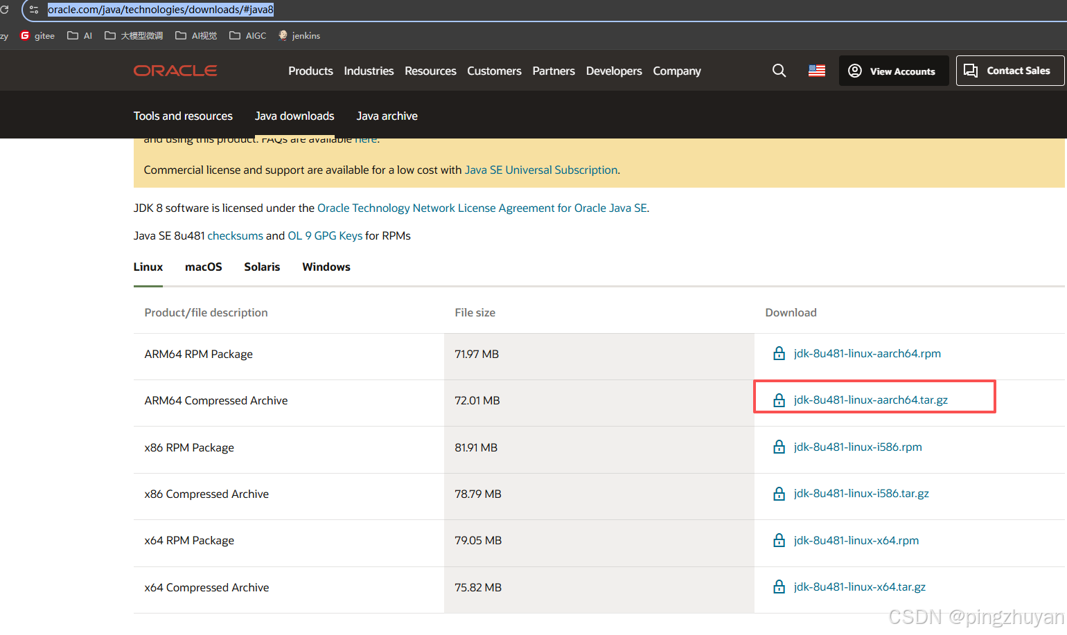 oracle官网下载地址:https://www.oracle.com/java/technologies/downloads/#java8