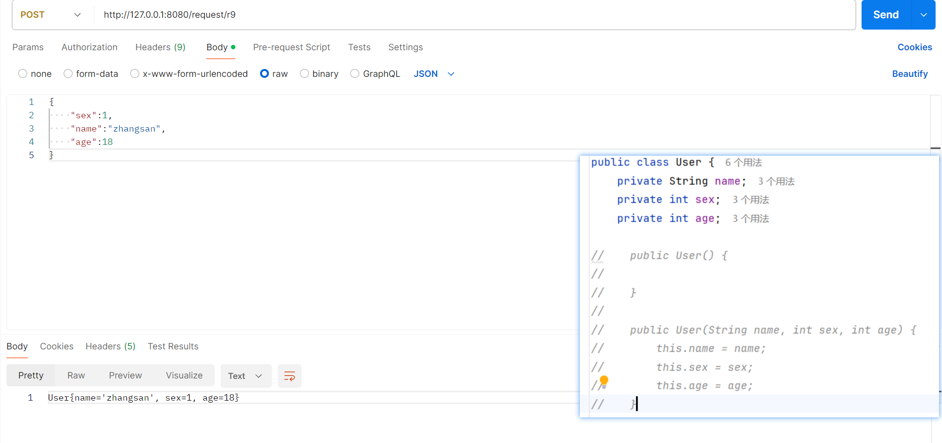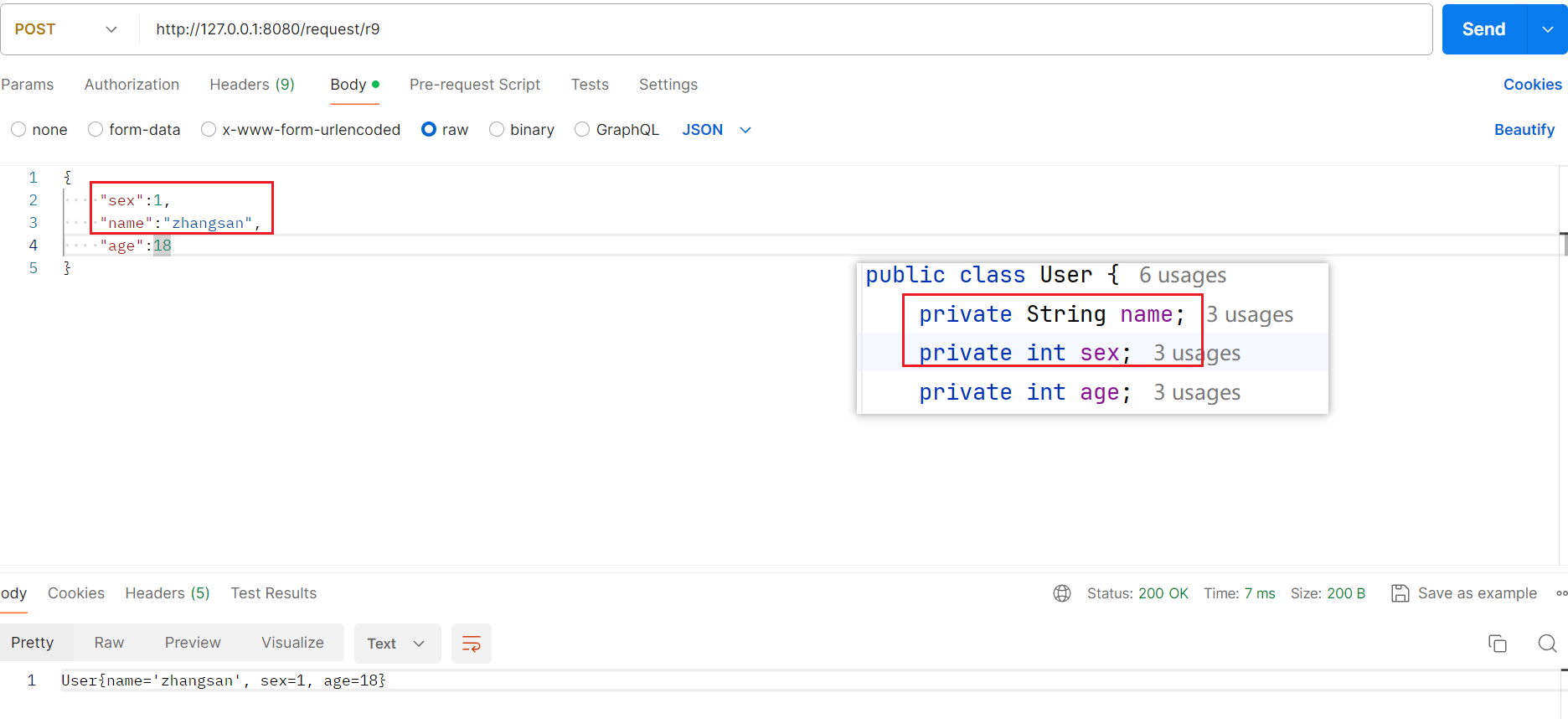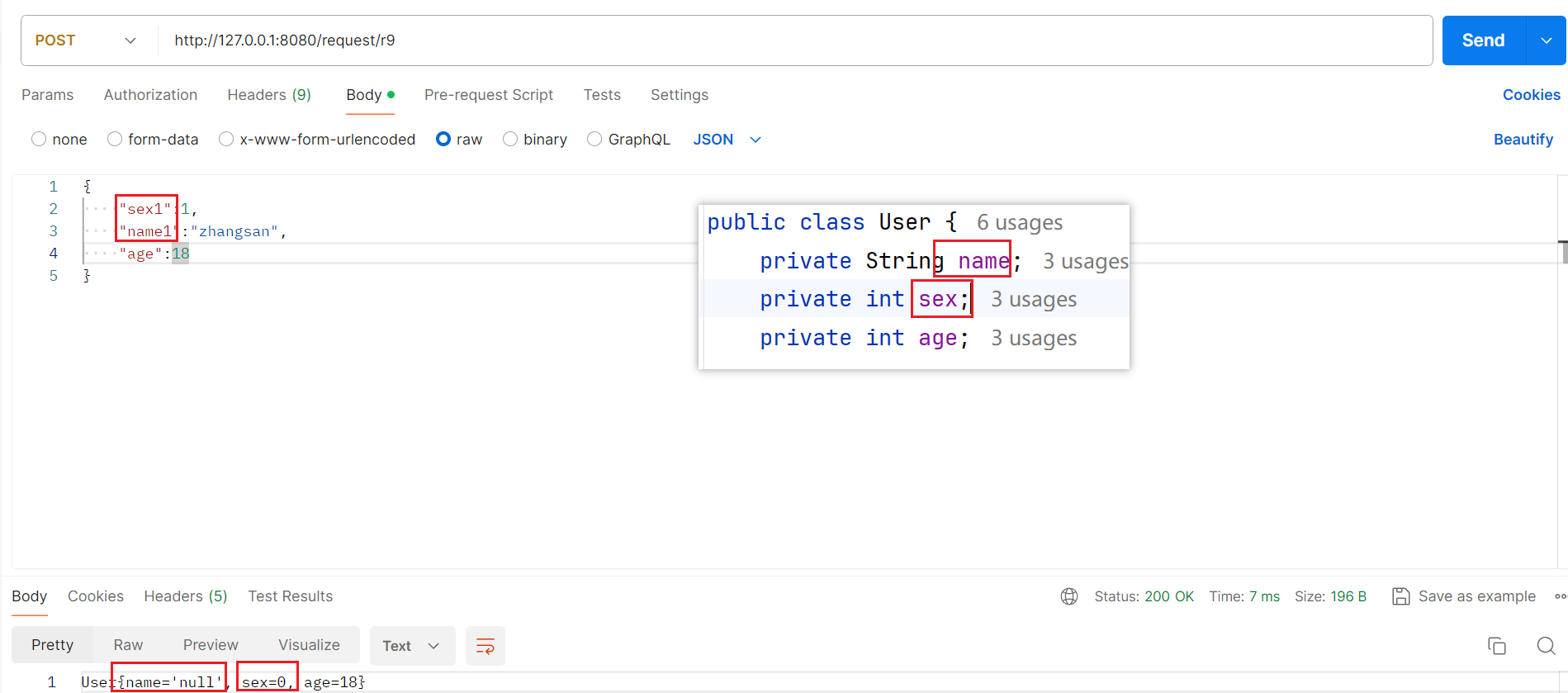 json数据中,sex 和 name 的顺序,和类的属性的定义顺序不一样,也能够接收数据。