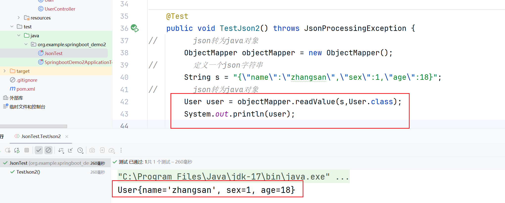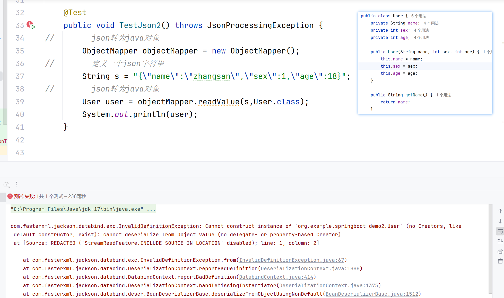 这里需要使用到一个新的方法:readValue(s,User.class)