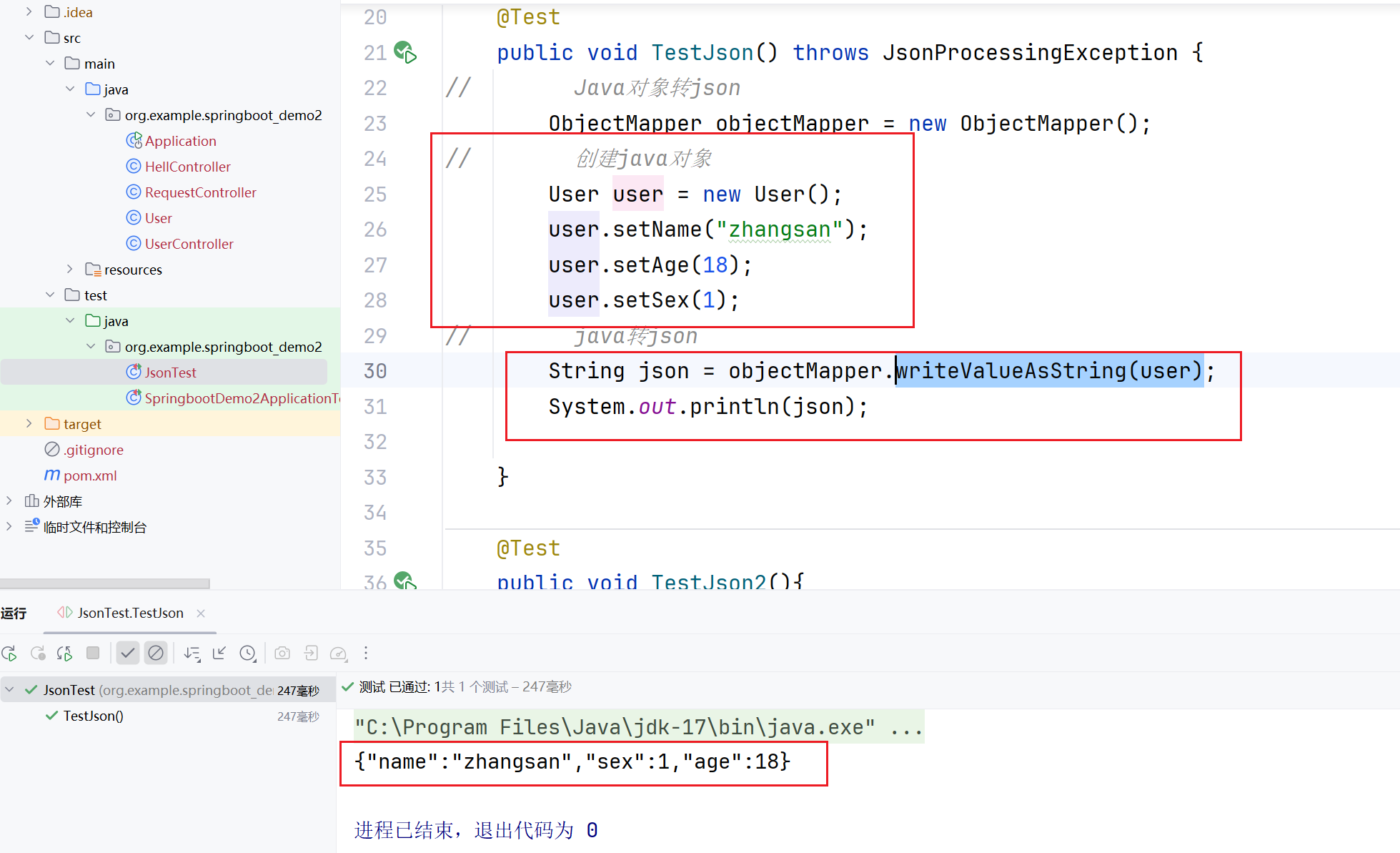 还会使用到一个新的方法:writeValueAsString(),用于 java对象转为json的一个方法