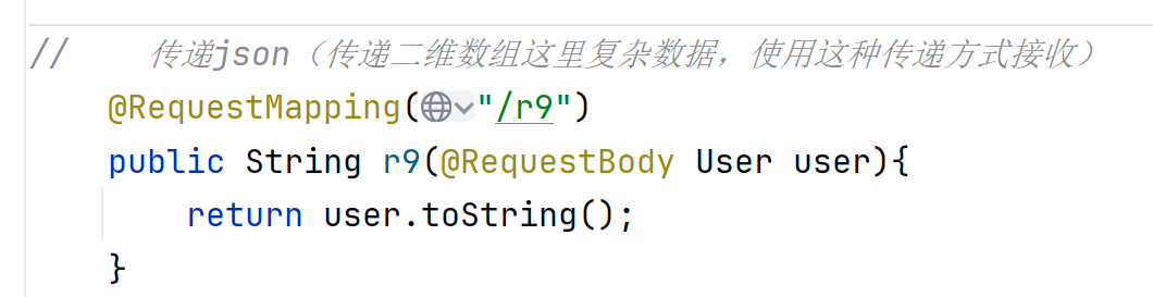 // 客户端传递一个JSON数据,服务器使用 User对象接收(使用 @RequestBody 绑定)