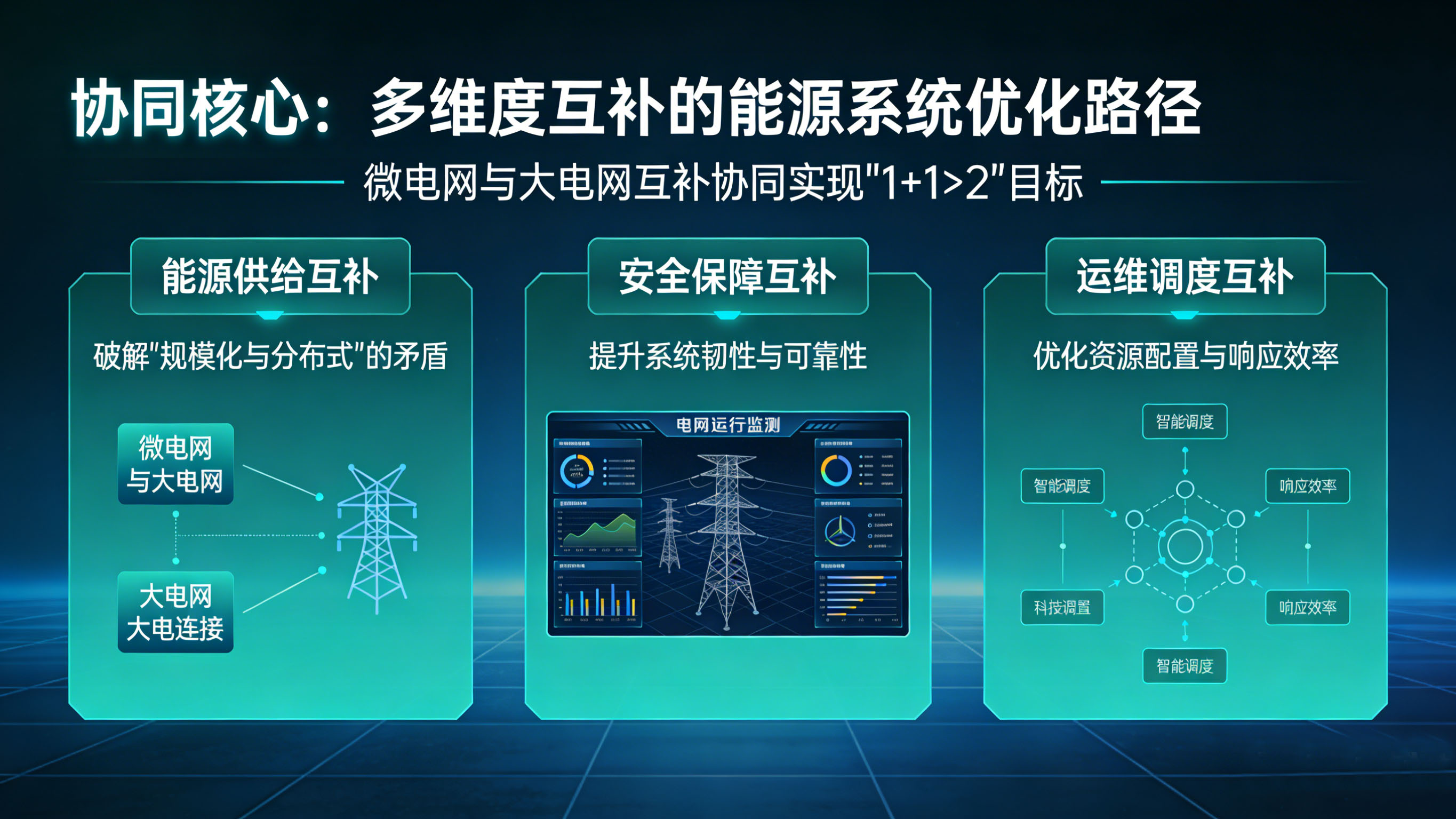- 大电网的广域调控能力与微电网的局部自治能力形成安全保障互补,提升能源系统的抗风险能力