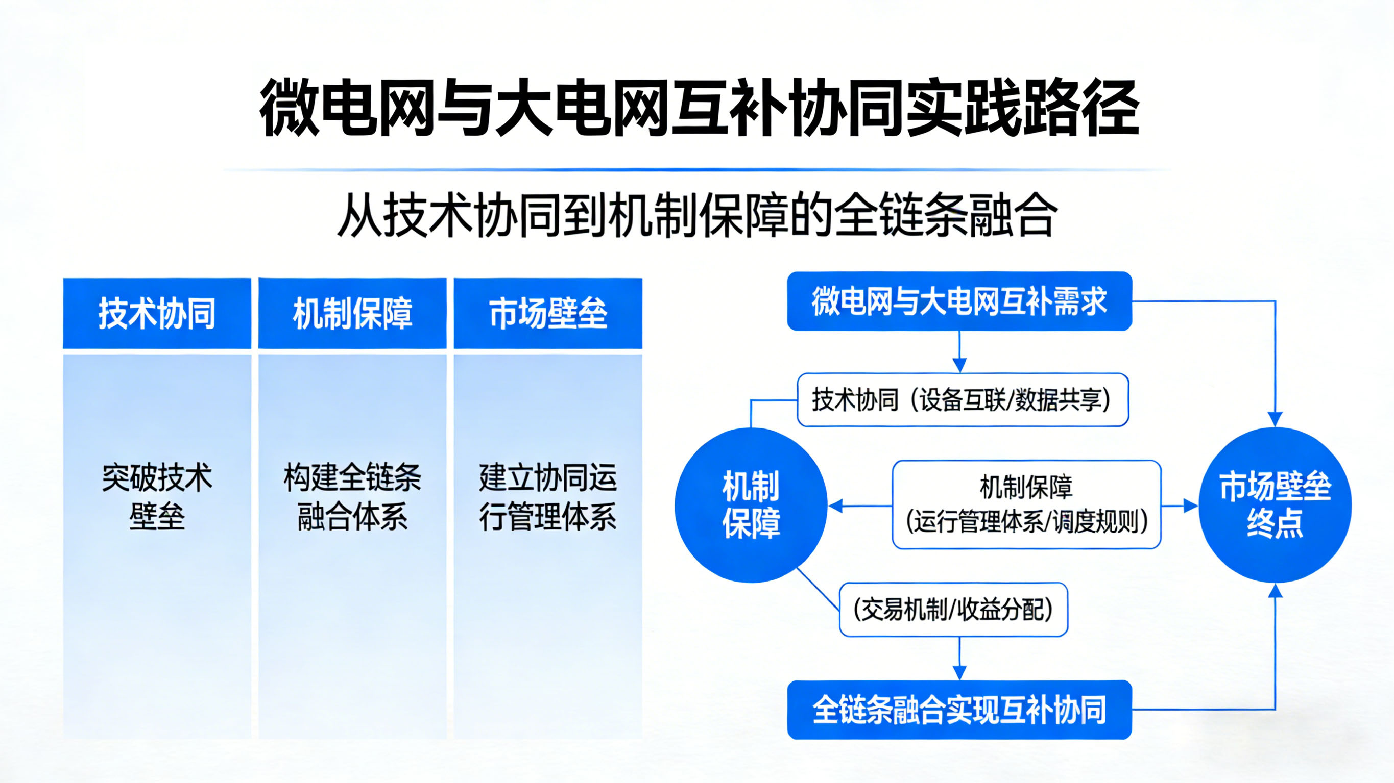 实现微电网与大电网的互补协同,需突破技术、机制、市场三大壁垒,构建全链条融合体系。