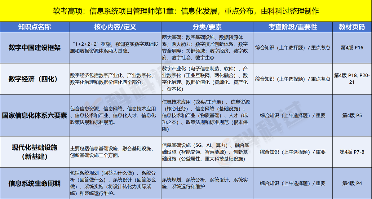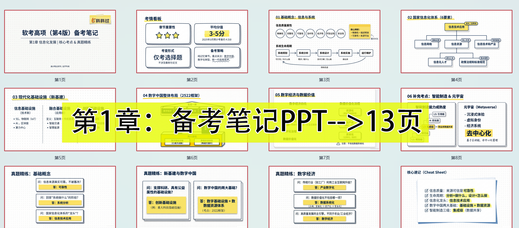 这份备考指南针对软考高级信息系统项目管理师 的第一章内容,旨在为考生提供高效的复习框架与核心考点解析。文章首先通过分值比例与趋势分析 界定了本章在考试中侧重于纯记忆类的选择题,随后系统梳理了信息化体系六要素 、新基建 以及数字中国 等关键政策导向。其核心逻辑聚焦于数字经济的四化框架 与信息系统的全生命周期模型 ,帮助读者快速掌握从信息传输到数字化转型的专业概念辨析。通过将理论知识与高频习题 结合,该资料不仅明确了备考的重点路径,更通过具体的解析环节强化了考生对产业数字化 和数据价值化等前沿术语的理解深度。
