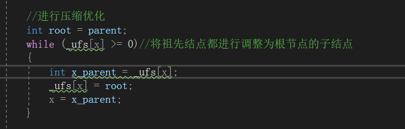 while (_ufs[x] >= 0)//将祖先结点都进行调整为根节点的子结点