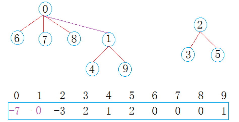 当然还是有可能继续合并成一个集合,这这种情况下,原本作为组长的1变成了0的组员,那么它的对应下标存储的内容应该加到0下标的位置上去,使得0成为根结点,0集合中一共有7个结点,而1下标所存储的内容应该变成它的父结点0