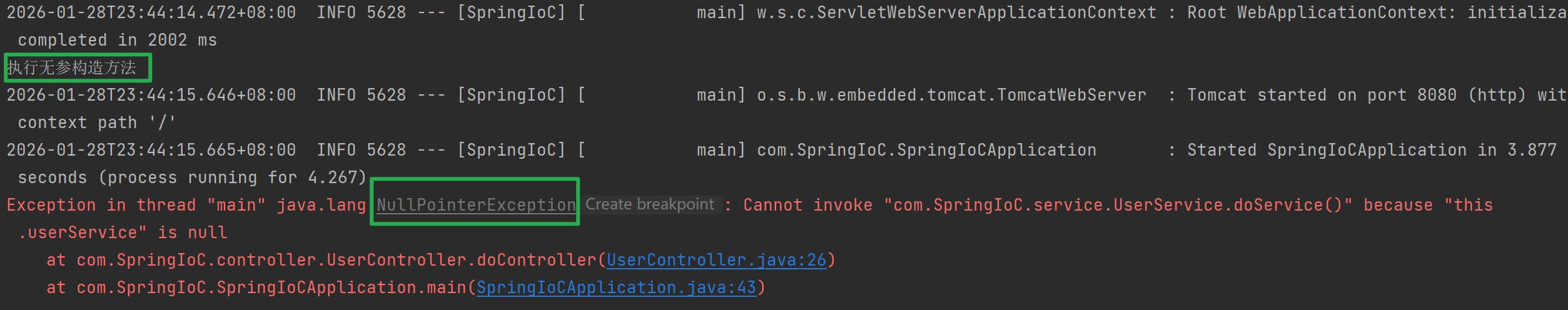 发现userService.doService();报NullPointerException空指针异常。说明并没有进行赋值。需要加注解@Autowired: