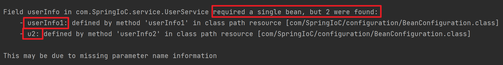 getBean不能用纯类名的方式获取对象,会抛出NoUniqueBeanDefinitionException异常。Bean名称为方法名(默认规则),修改方式eg:@Bean(name = "u2")或多个名字都可以的eg:@Bean(name = {"u2", "userInfo2"})