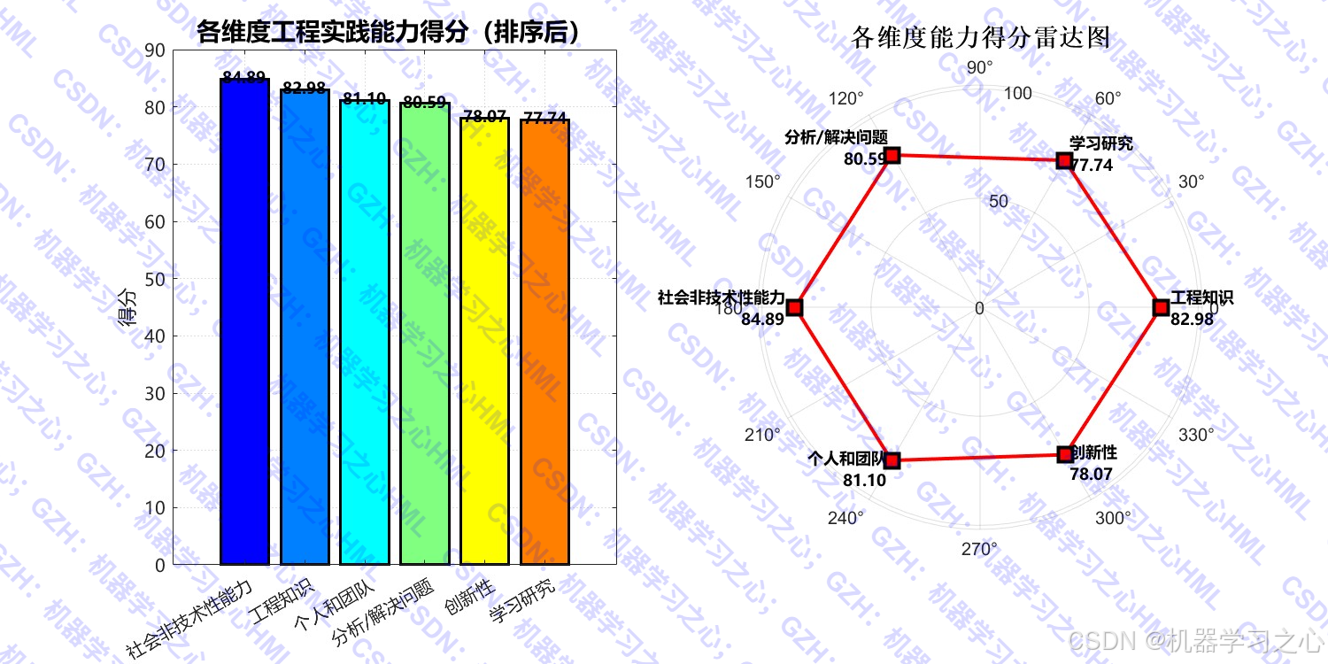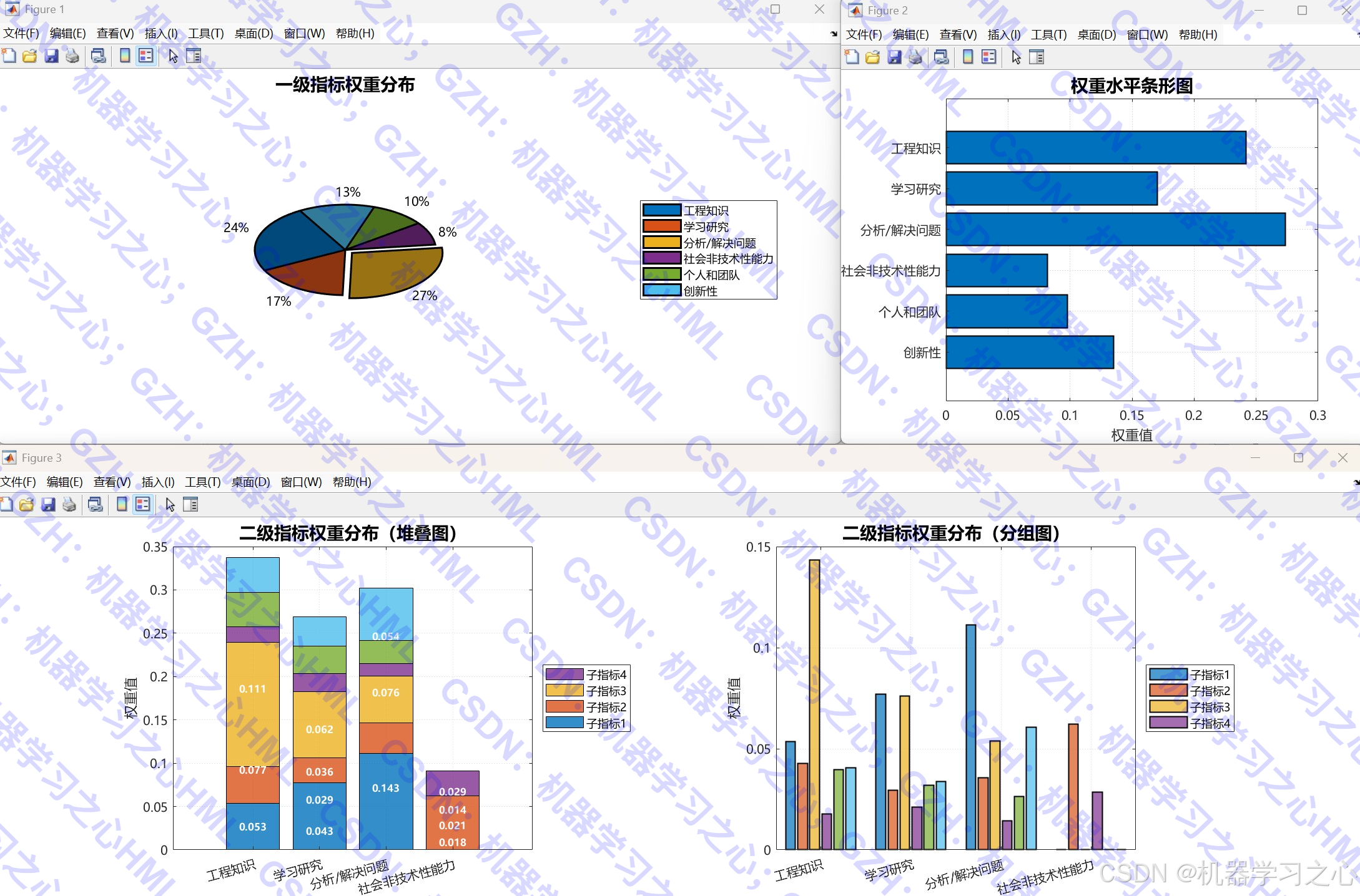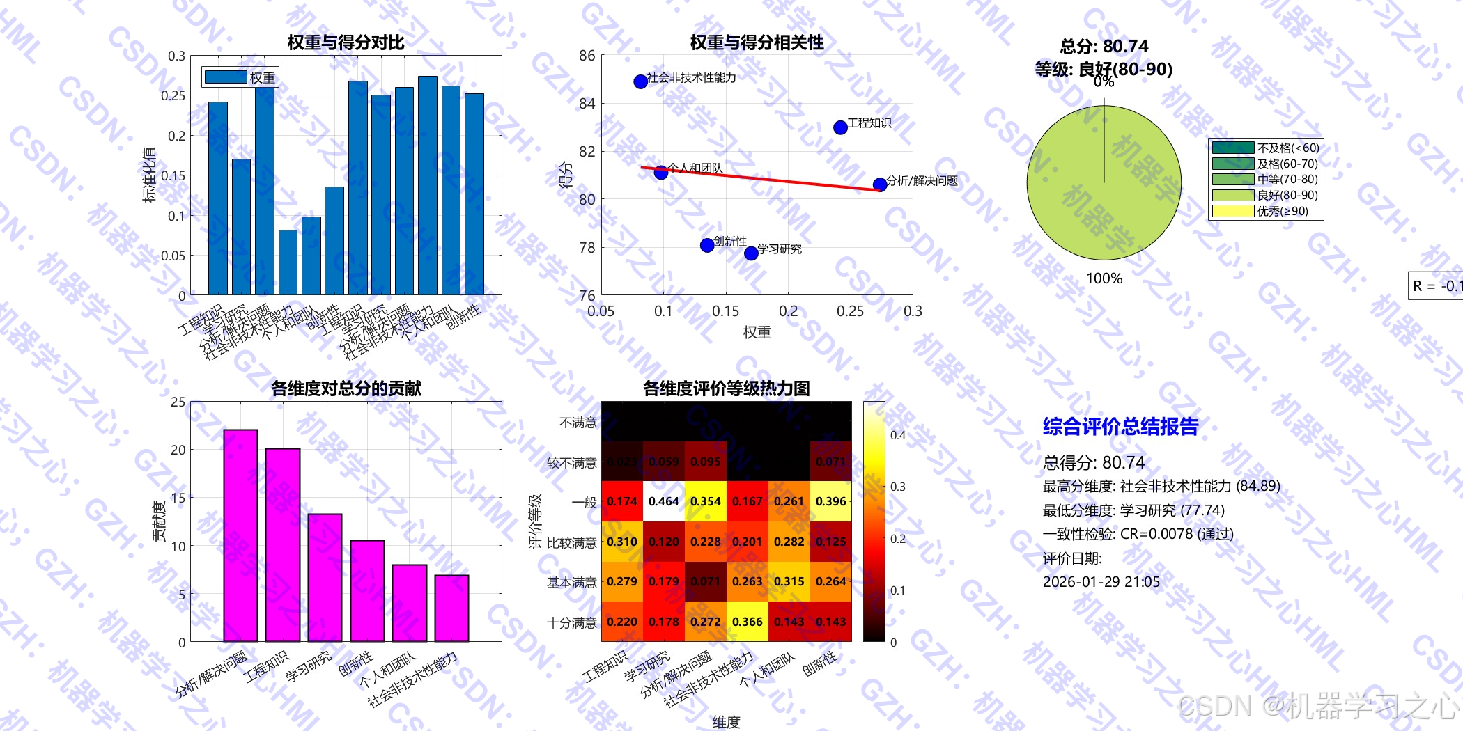 这段MATLAB代码实现了一个基于AHP(层次分析法)-模糊综合评价法的工程实践能力评价系统,适用于对工程类学生或从业者的综合能力进行量化评估与可视化分析。